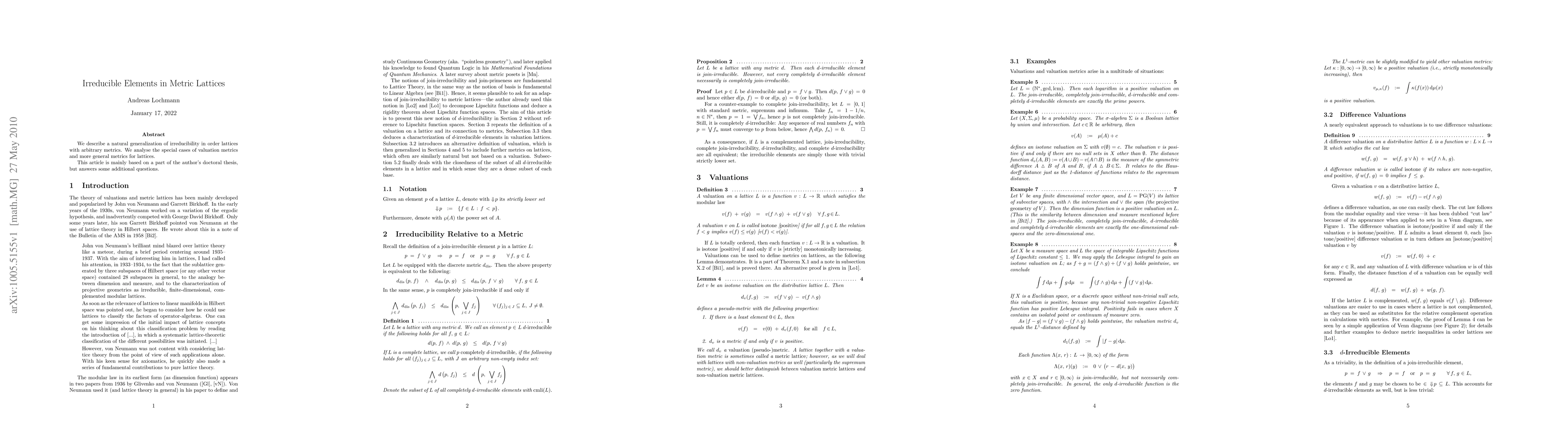 This research paper introduces a broadened concept of irreducibility in order lattices equipped with metrics, exploring valuation metrics and broader metric applications. It stems from the author's doctoral thesis, addressing supplementary questions in the field.
