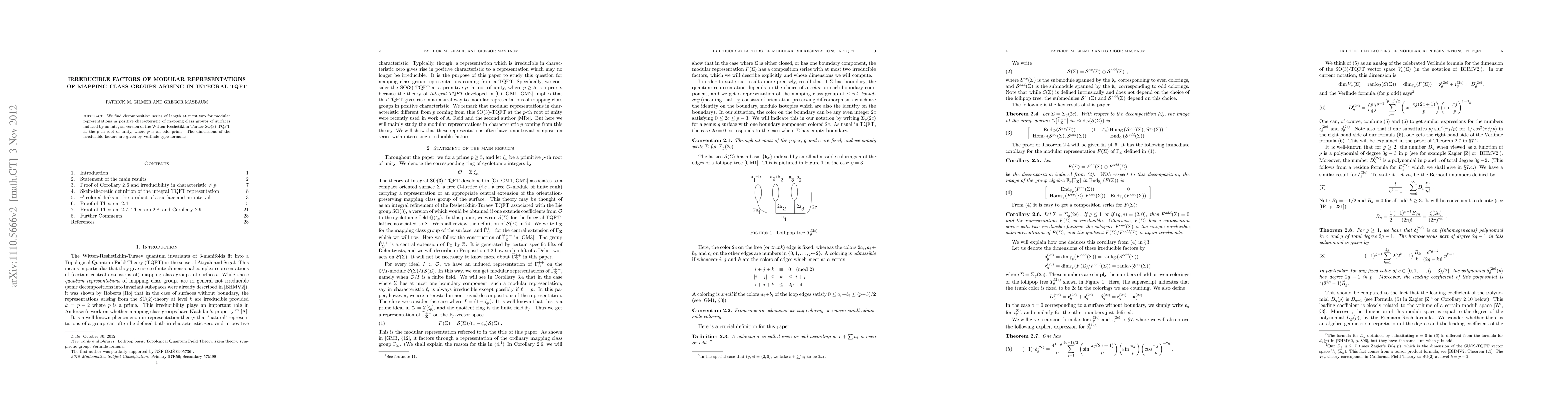 Summary: This research identifies decomposition series of up to two levels for modular representations of mapping class groups of surfaces in integral TQFT, providing dimensions for irreducible factors through Verlinde-type formulas, applicable at the p-th root of unity for odd primes p.
