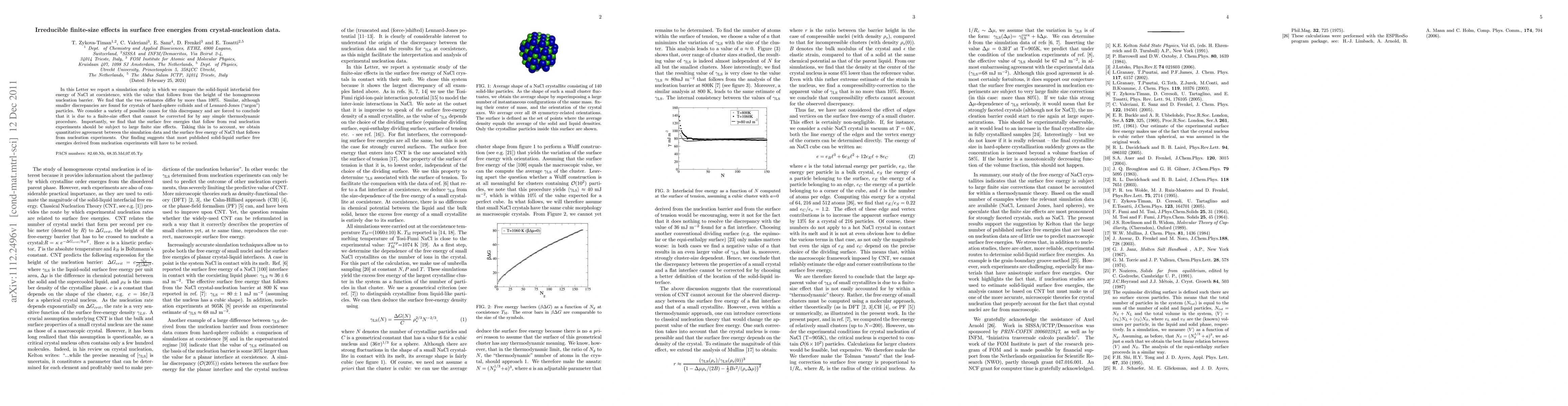 In this Letter we report a simulation study in which we compare the solid-liquid interfacial free energy of NaCl at coexistence, with the value that follows from the height of the homogeneous nucleation barrier. We find that the two estimates differ by more than 100%. Similar, although smaller discrepancies are found for crystals of hard-sphere colloids and of Lennard-Jones ("argon") particles. We consider a variety of possible causes for this discrepancy and are forced to conclude that it is due to a finite-size effect that cannot be corrected for by any simple thermodynamic procedure. Importantly, we find that the surface free energies that follow from real nucleation experiments should be subject to large finite size effects. Taking this in to account, we obtain quantitative agreement between the simulation data and the surface free energy of NaCl that follows from nucleation experiments. Our finding suggests that most published solid-liquid surface free energies derived from nucleation experiments will have to be revised.