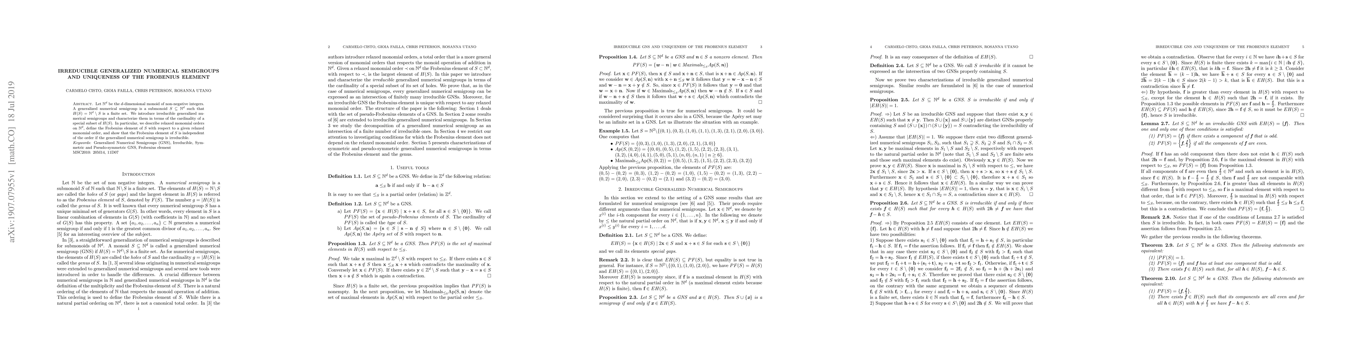 This paper introduces irreducible generalized numerical semigroups and characterizes them based on a special subset's cardinality. It also defines the Frobenius element for these semigroups under relaxed monomial orders and proves that the Frobenius element is unique when the semigroup is irreducible.