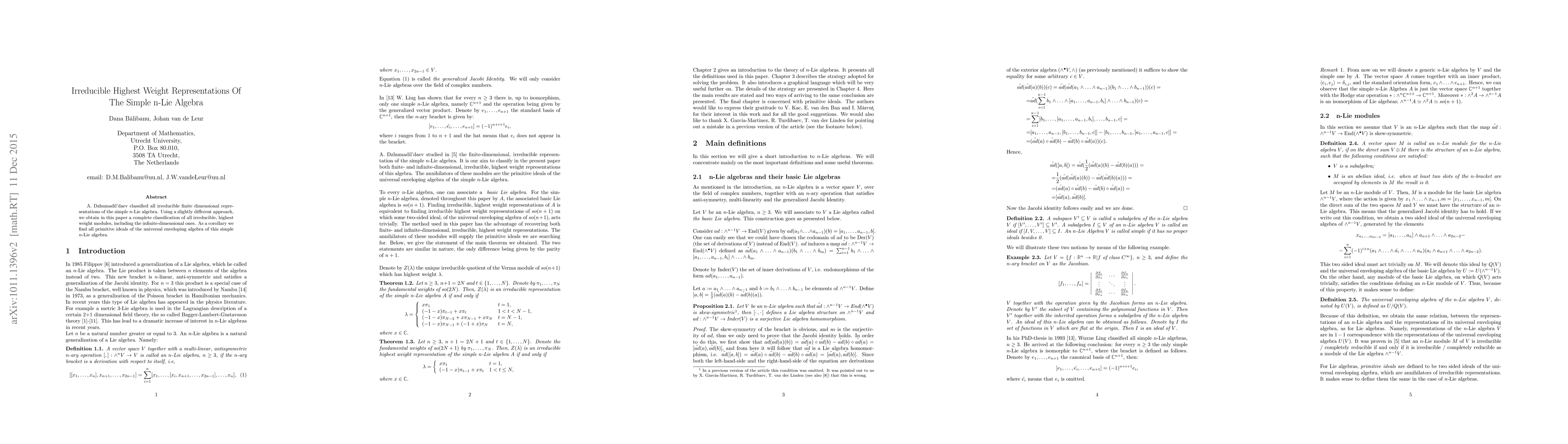 A. Dzhumadil'daev classified all irreducible finite dimensional representations of the simple n-Lie algebra. Using a slightly different approach, we obtain in this paper a complete classification of all irreducible, highest weight modules, including the infinite-dimensional ones. As a corollary we find all primitive ideals of the universal enveloping algebra of this simple n-Lie algebra.
