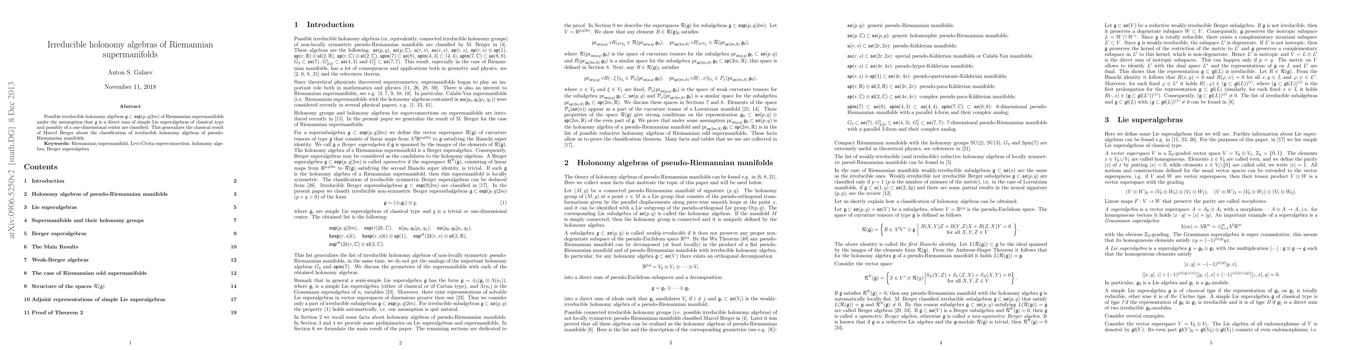 This paper classifies possible irreducible holonomy algebras $\g\subset\osp(p,q|2m)$ for Riemannian supermanifolds, generalizing Berger's classical result for pseudo-Riemannian manifolds, under the assumption that $\g$ comprises direct sums of simple Lie superalgebras of classical type and potentially a one-dimensional center.