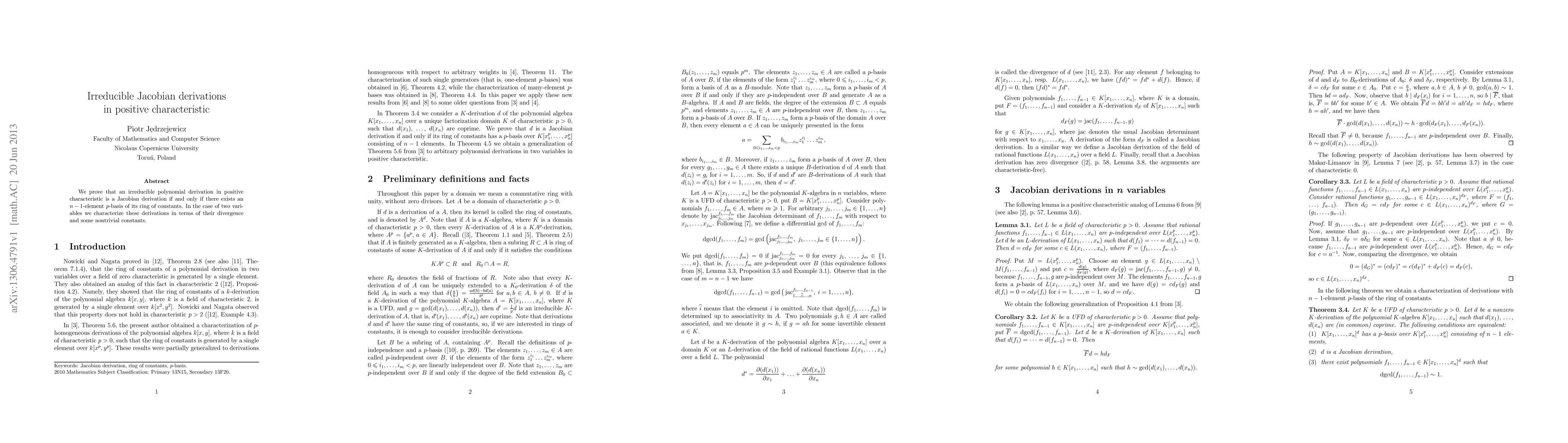 Researchers prove that in positive characteristic, an irreducible polynomial derivation is a Jacobian derivation if and only if it has an n-1-element p-basis of its ring of constants.