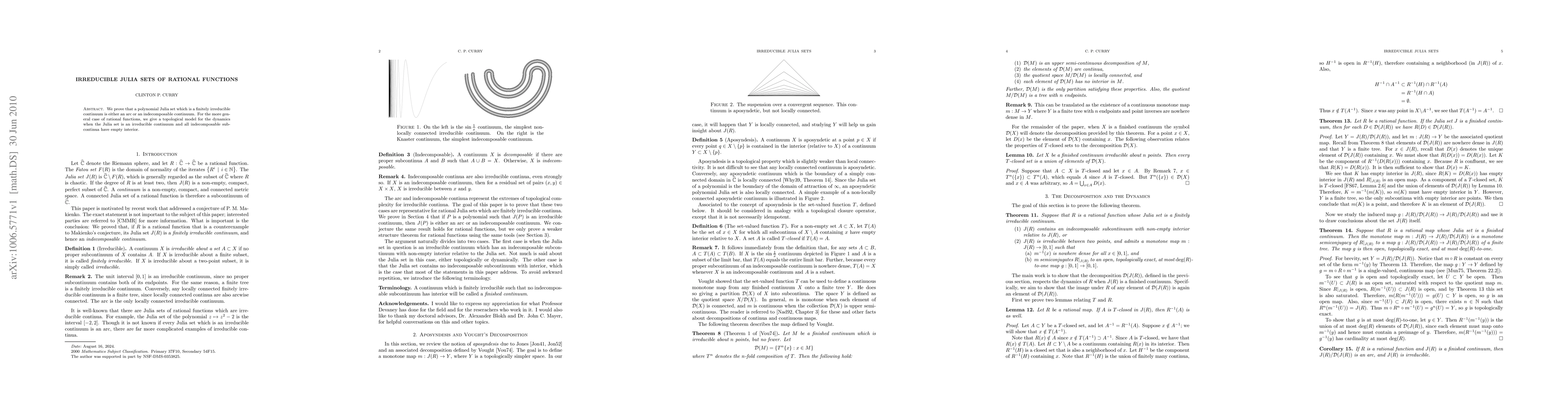 This research proves that finitely irreducible Julia sets of rational functions are either arcs or indecomposable continuums. It also provides a topological model for the dynamics when the Julia set is an irreducible continuum with empty interior subcontinua.