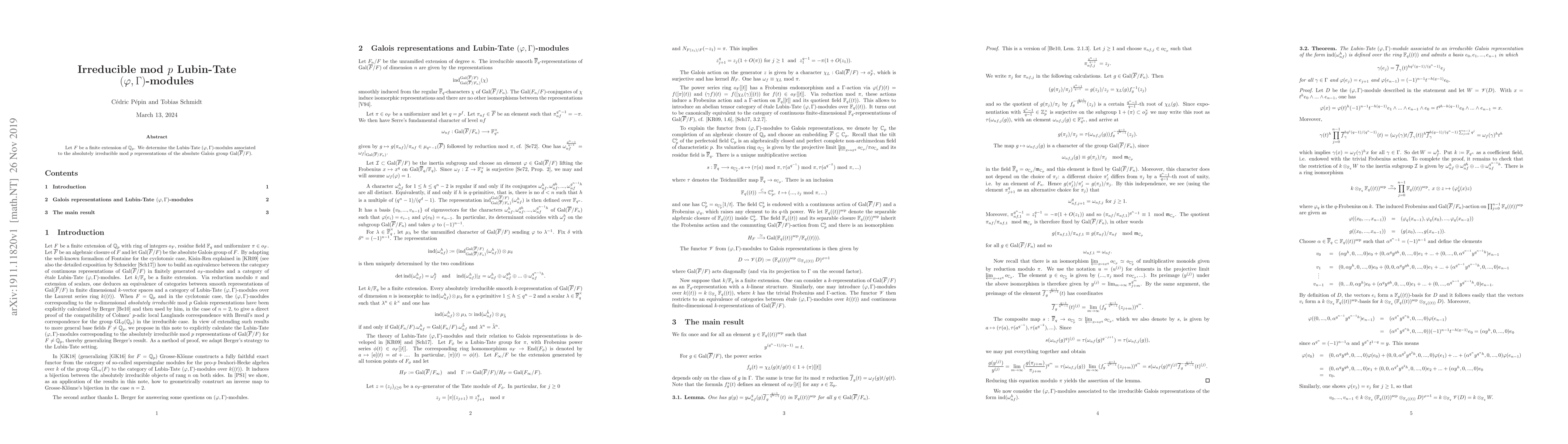 Summary: This paper identifies Lubin-Tate $(\varphi,\Gamma)$-modules linked to absolutely irreducible mod $p$ representations of the absolute Galois group of a finite $p$-adic field extension, contributing to the understanding of $p$-adic Galois representations.