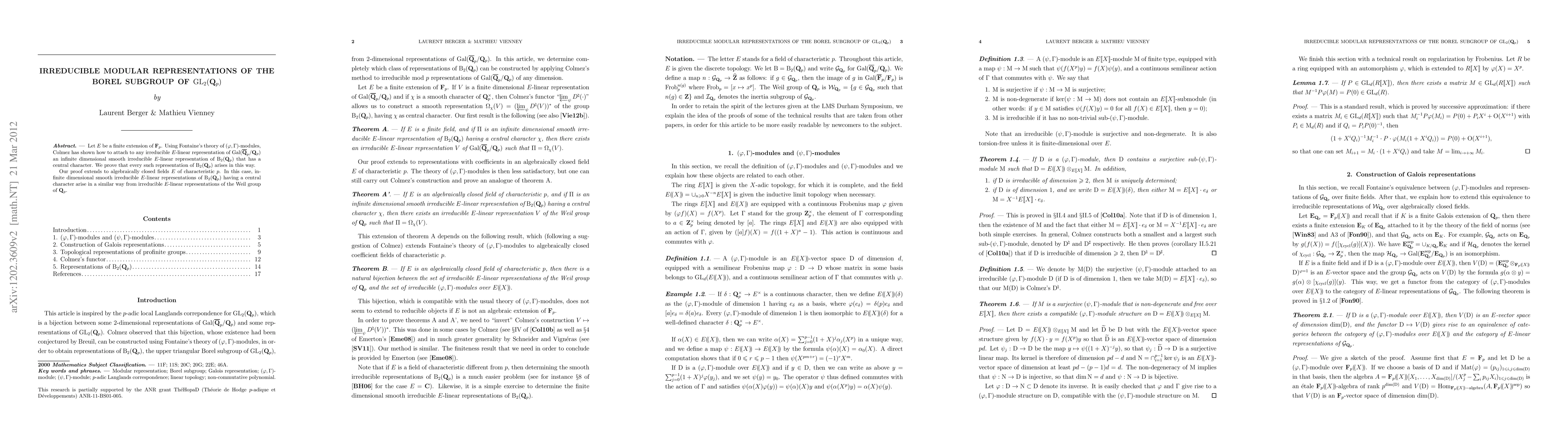 Let E be a finite extension of Fp. Using Fontaine's theory of (phi,Gamma)-modules, Colmez has shown how to attach to any irreducible E-linear representation of Gal(Qpbar/Qp) an infinite dimensional smooth irreducible E-linear representation of B_2(Qp) that has a central character. We prove that every such representation of B_2(Qp) arises in this way. Our proof extends to algebraically closed fields E of characteristic p. In this case, infinite dimensional smooth irreducible E-linear representations of B_2(Qp) having a central character arise in a similar way from irreducible E-linear representations of the Weil group of Qp.