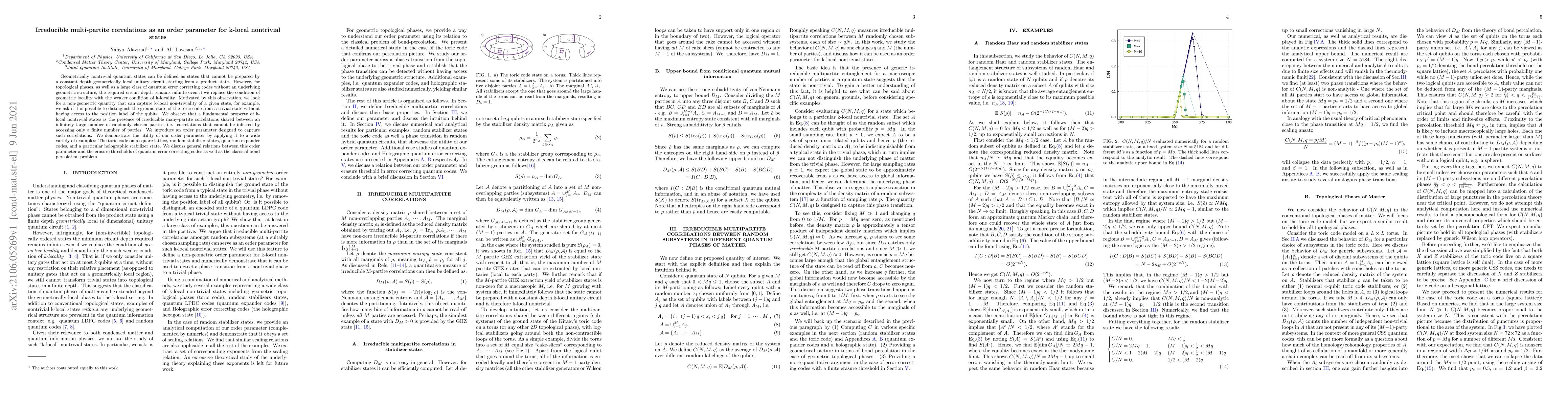 Geometrically nontrivial quantum states can be defined as states that cannot be prepared by a constant depth geometrically local unitary circuit starting from a product state. However, for topological phases, as well as a large class of quantum error correcting codes without an underlying geometric structure, the required circuit depth remains infinite even if we replace the condition of geometric locality with the weaker condition of k-locality. Motivated by this observation, we look for a non-geometric quantity that can capture k-local non-triviality of a given state, for example, we ask if it is possible to distinguish the ground state of the toric code from a trivial state without having access to the position label of the qubits. We observe that a fundamental property of k-local nontrivial states is the presence of irreducible many-partite correlations shared between an infinitely large number of randomly chosen parties, i.e. correlations that cannot be inferred by accessing only a finite number of parties. We introduce an order parameter designed to capture such correlations. We demonstrate the utility of our order parameter by applying it to a wide variety of examples: The toric code on a square lattice, random stabilizer states, quantum expander codes, and a particular holographic stabilizer state. We discuss general relations between this order parameter and the erasure thresholds of quantum error correcting codes as well as the classical bond percolation problem.