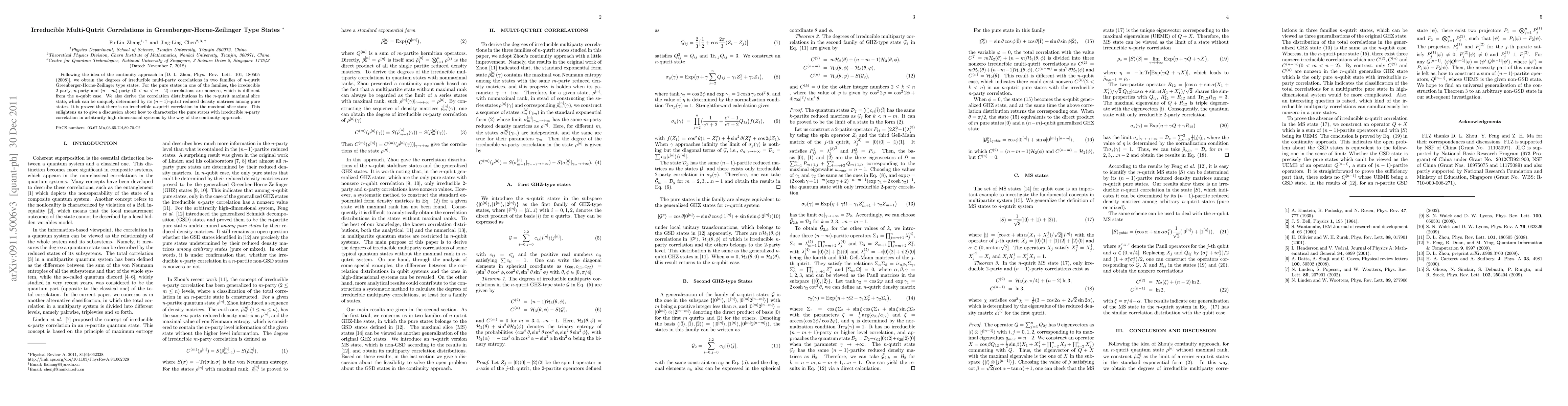 Following the idea of the continuity approach in [D. L. Zhou, Phys. Rev. Lett. 101, 180505 (2008)], we obtain the degrees of irreducible multi-party correlations in two families of $n$-qutrit Greenberger-Horne-Zeilinger type states. For the pure states in one of the families, the irreducible 2-party, $n$-party and $(n-m)$-party ($0< m < n-2$) correlations are nonzero, which is different from the $n$-qubit case. We also derive the correlation distributions in the $n$-qutrit maximal slice state, which can be uniquely determined by its $(n-1)$-qutrit reduced density matrices among pure states. It is proved that there is no irreducible $n$-qutrit correlation in the maximal slice state. This enlightens us to give a discussion about how to characterize the pure states with irreducible $n$-party correlation in arbitrarily high-dimensional systems by the way of the continuity approach.
