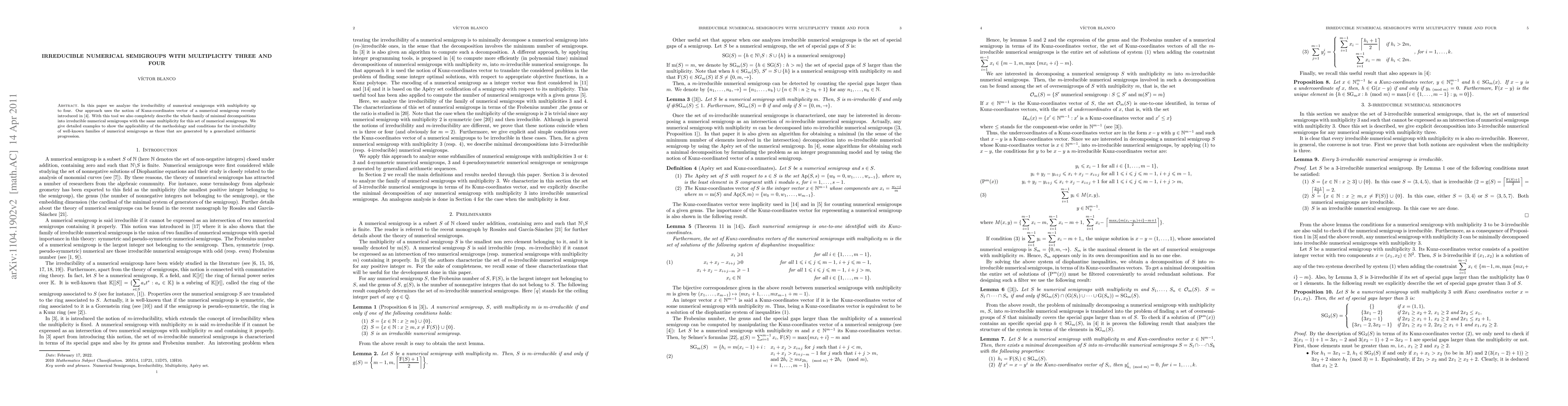 This paper investigates the irreducibility of numerical semigroups with multiplicities three and four, utilizing Kunz-coordinates. It provides a complete description of minimal decompositions and demonstrates the methodology with examples, including conditions for well-known families like generalized arithmetic progressions.