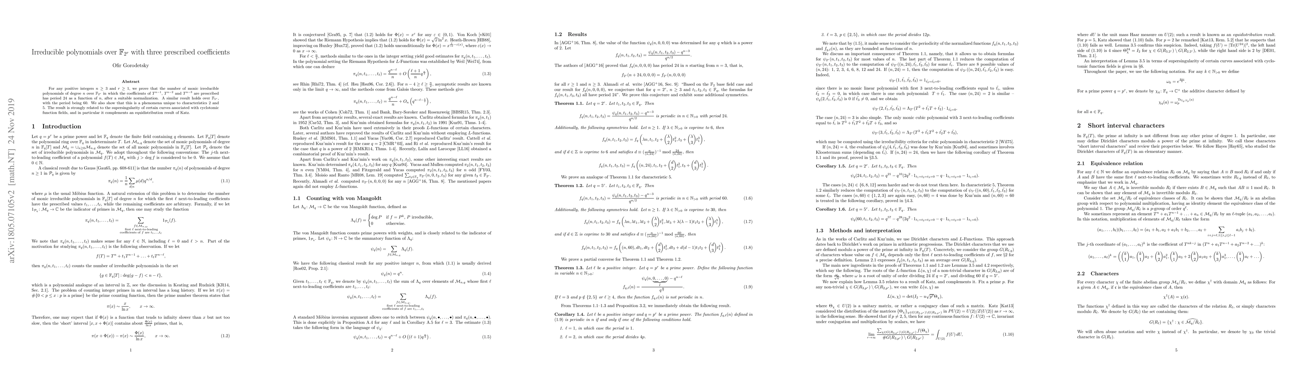 For any positive integers $n \ge 3$ and $r \ge 1$, we prove that the number of monic irreducible polynomials of degree $n$ over $\mathbb{F}_{2^r}$ in which the coefficients of $T^{n-1}$, $T^{n-2}$ and $T^{n-3}$ are prescribed has period $24$ as a function of $n$, after a suitable normalization. A similar result holds over $\mathbb{F}_{5^r}$, with the period being $60$. We also show that this is a phenomena unique to characteristics $2$ and $5$. The result is strongly related to the supersingularity of certain curves associated with cyclotomic function fields, and in particular it complements an equidistribution result of Katz.