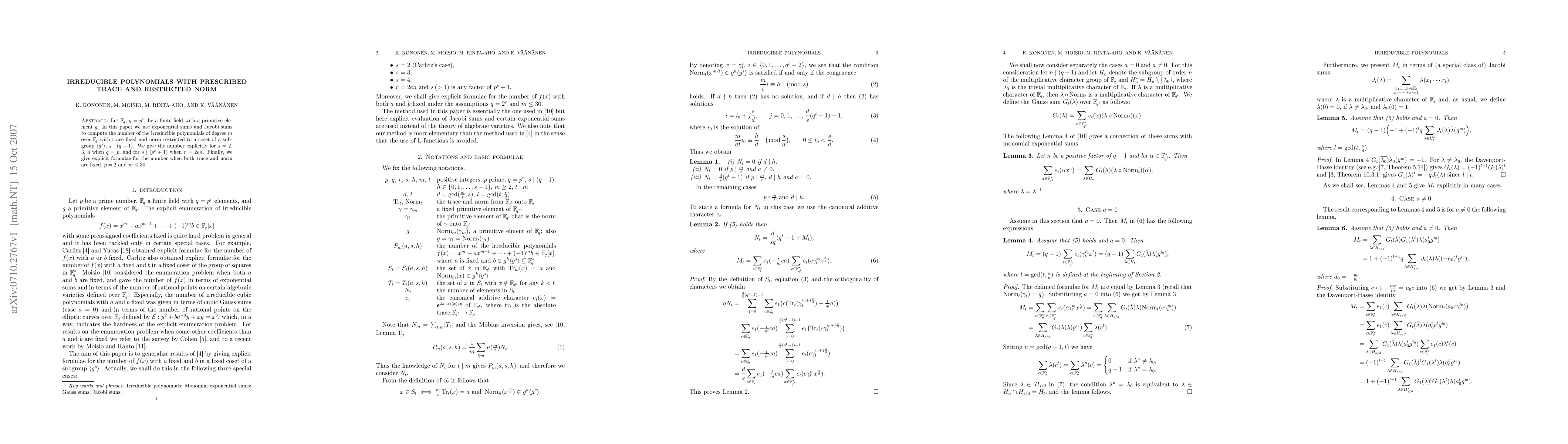 This paper counts irreducible polynomials of degree m over a finite field GF(q) with fixed trace and norm restricted to specific subgroups, using exponential sums and Jacobi sums. The results provide explicit formulae for certain cases.