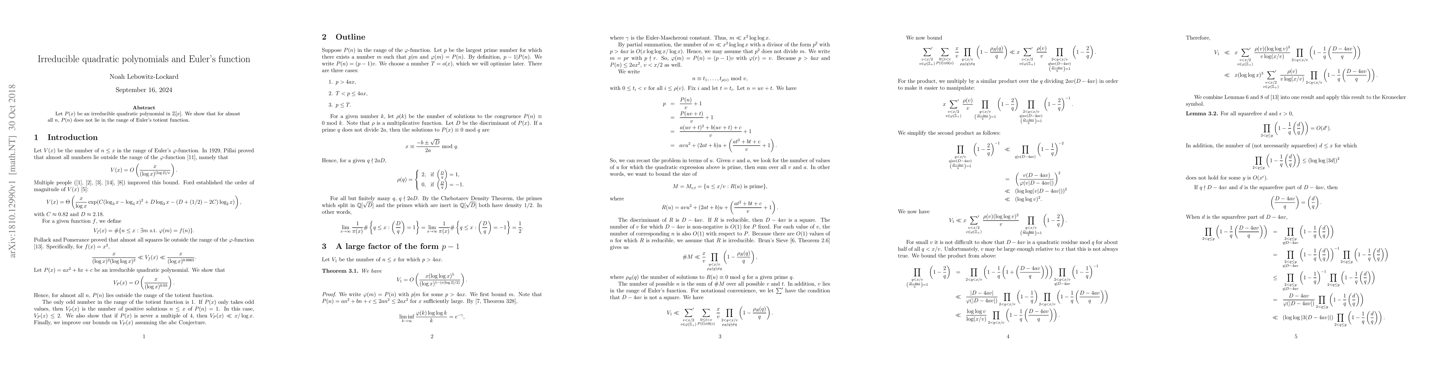 A research paper shows that most values of an irreducible quadratic polynomial P(x) will not match any number n for which Euler's totient function has a value, except almost all values of n.