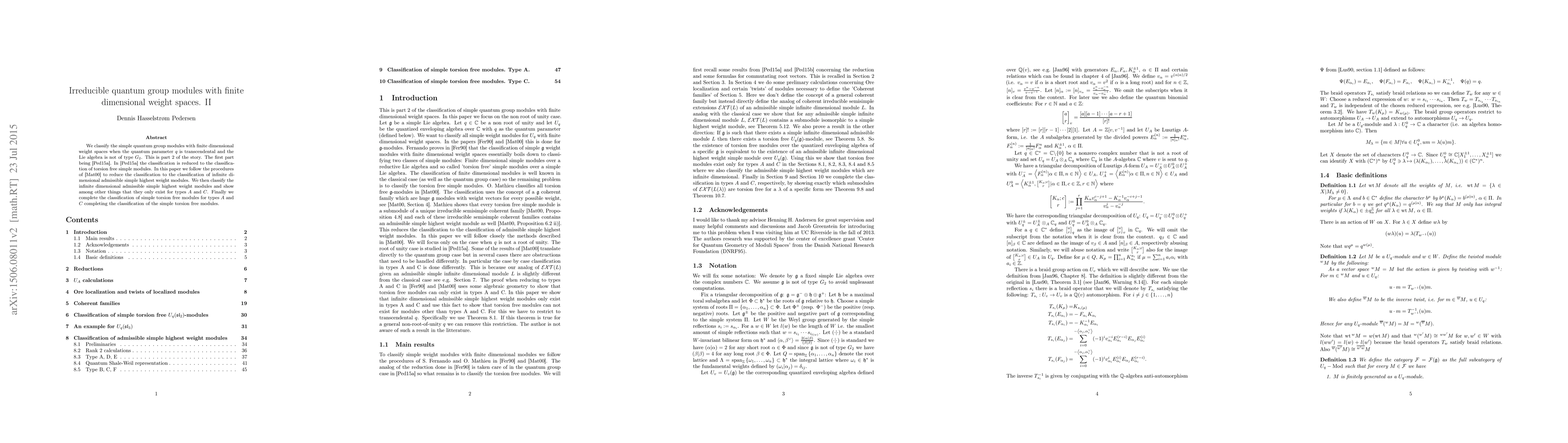We classify the simple quantum group modules with finite dimensional weight spaces when the quantum parameter $q$ is transcendental and the Lie algebra is not of type $G_2$. This is part $2$ of the story. The first part being Irreducible quantum group modules with finite dimensional weight spaces. I (arXiv:1504.07042). In that paper the classification is reduced to the classification of torsion free simple modules. In this paper we follow the procedures used by O. Mathieu to reduce the classification to the classification of infinite dimensional admissible simple highest weight modules. We then classify the infinite dimensional admissible simple highest weight modules and show among other things that they only exist for types $A$ and $C$. Finally we complete the classification of simple torsion free modules for types $A$ and $C$ completing the classification of the simple torsion free modules.