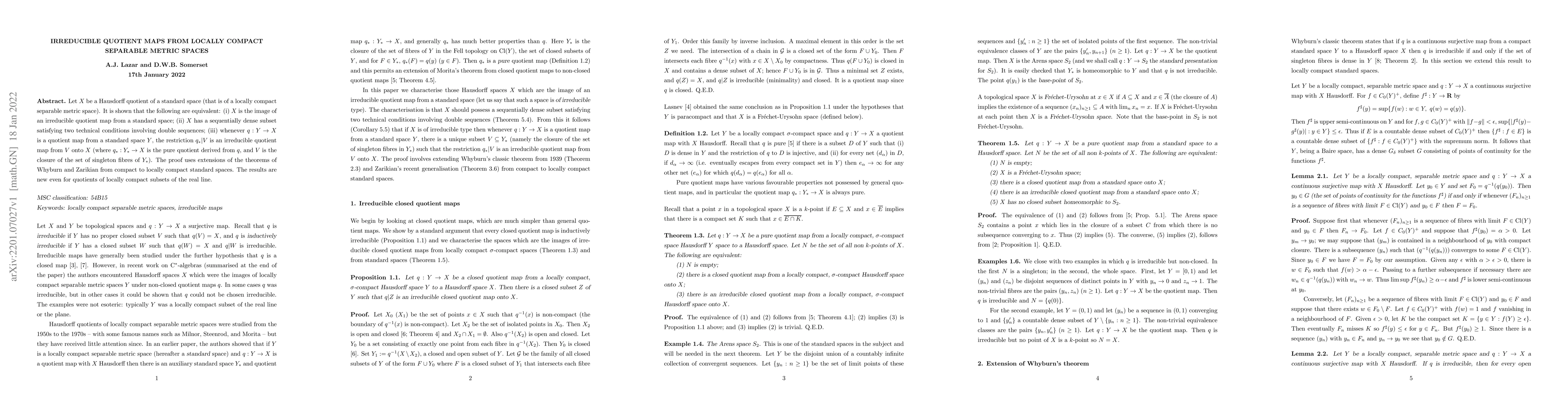 Let X be a Hausdorff quotient of a standard space (that is of a locally compact separable metric space). It is shown that the following are equivalent: (i) X is the image of an irreducible quotient map from a standard space; (ii) X has a sequentially dense subset satisfying two technical conditions involving double sequences; (iii) whenever q : Y\to X is a quotient map from a standard space Y , the restriction q_{\st}|V is an irreducible quotient map from V onto X (where q_{\st} : Y_{\st}\to X is the pure quotient derived from q, and V is the closure of the set of singleton fibres of Y_{\st}). The proof uses extensions of the theorems of Whyburn and Zarikian from compact to locally compact standard spaces. The results are new even for quotients of locally compact subsets of the real line.