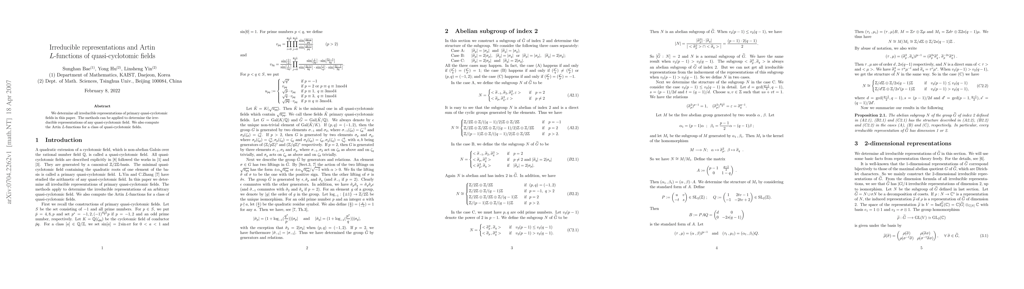Researchers determined irreducible representations for primary quasi-cyclotomic fields and computed Artin L-functions for a class of these fields, paving the way to analyze other quasi-cyclotomic fields.