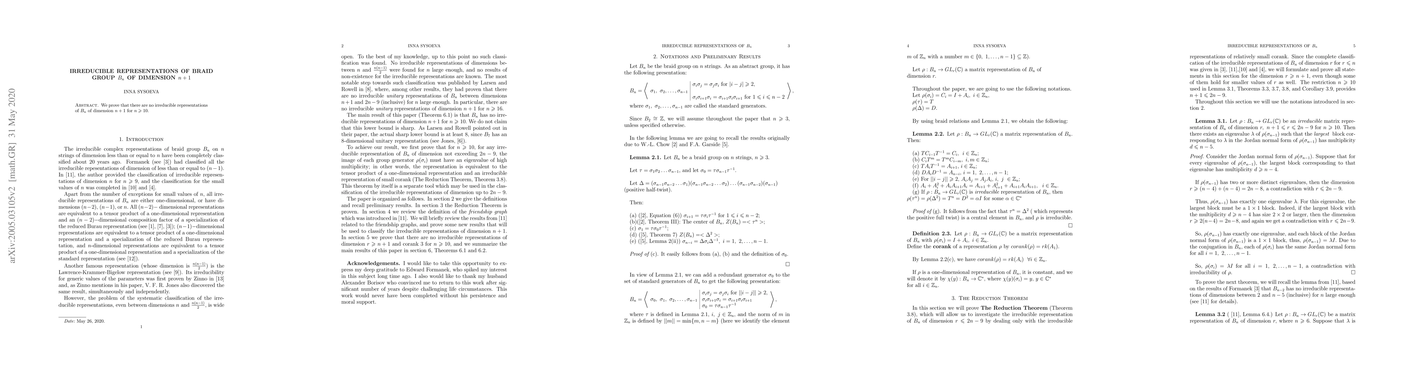 Title: Irreducible representations of Braid Group $B_n$ of dimension $n+1$ Summary: The study proves that there are no irreducible representations of the Braid Group $B_n$ with dimension $n+1$ for $n$ greater than or equal to 10.