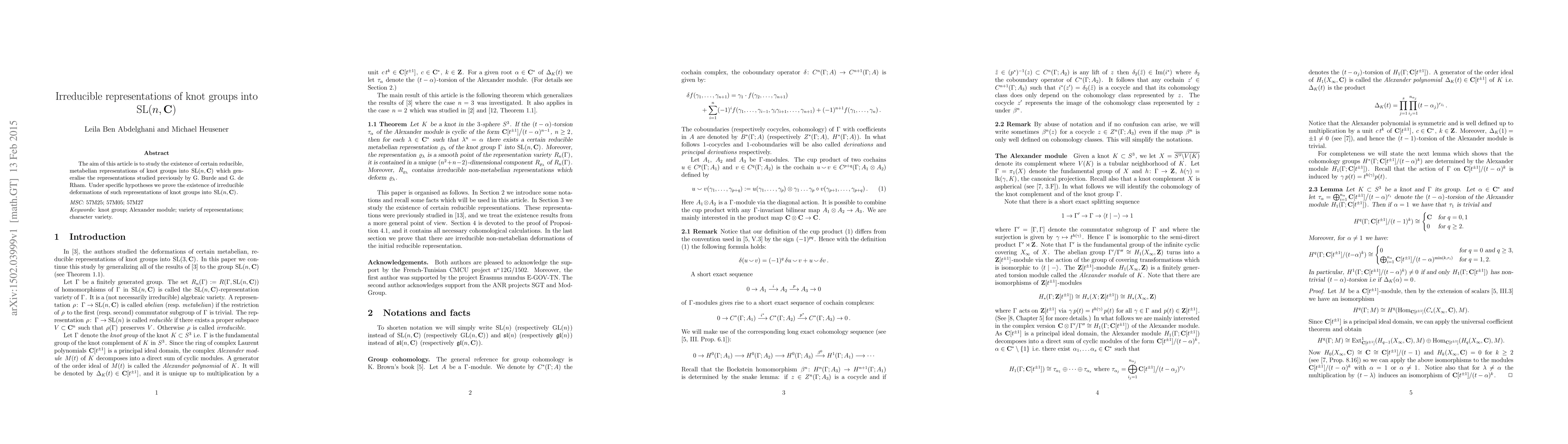 This paper investigates the existence of reducible, metabelian representations of knot groups into $\mathrm{SL}(n,\mathbf{C})$, extending prior work by Burde and de Rham, and proves the existence of irreducible deformations under specific conditions.