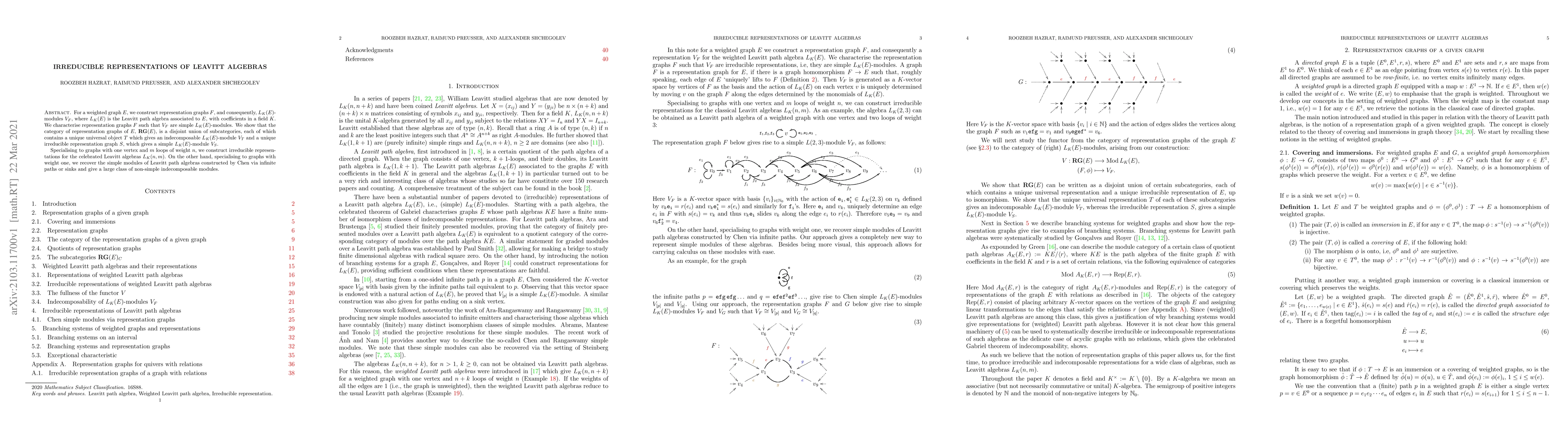 For a weighted graph $E$, we construct representation graphs $F$, and consequently, $L_K(E)$-modules $V_F$, where $L_K(E)$ is the Leavitt path algebra associated to $E$, with coefficients in a field $K$. We characterise representation graphs $F$ such that $V_F$ are simple $L_K(E)$-modules. We show that the category of representation graphs of $E$, $RG(E)$, is a disjoint union of subcategories, each of which contains a unique universal object $T$ which gives an indecomposable $L_K(E)$-module $V_T$ and a unique irreducible representation graph $S$, which gives a simple $L_K(E)$-module $V_S$. Specialising to graphs with one vertex and $m$ loops of weight $n$, we construct irreducible representations for the celebrated Leavitt algebras $L_K(n,m)$. On the other hand, specialising to graphs with weight one, we recover the simple modules of Leavitt path algebras constructed by Chen via infinite paths or sinks and give a large class of non-simple indecomposable modules.