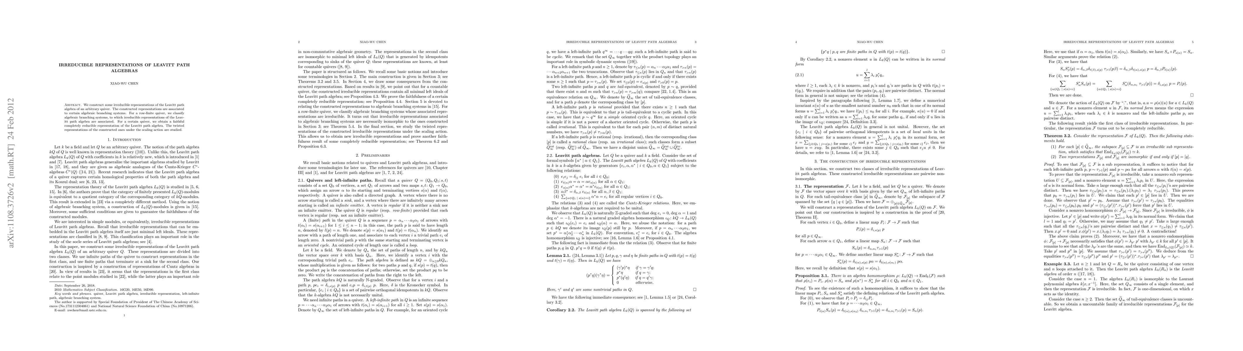 We construct some irreducible representations of the Leavitt path algebra of an arbitrary quiver. The constructed representations are associated to certain algebraic branching systems. For a row-finite quiver, we classify algebraic branching systems, to which irreducible representations of the Leavitt path algebra are associated. For a certain quiver, we obtain a faithful completely reducible representation of the Leavitt path algebra. The twisted representations of the constructed ones under the scaling action are studied.
