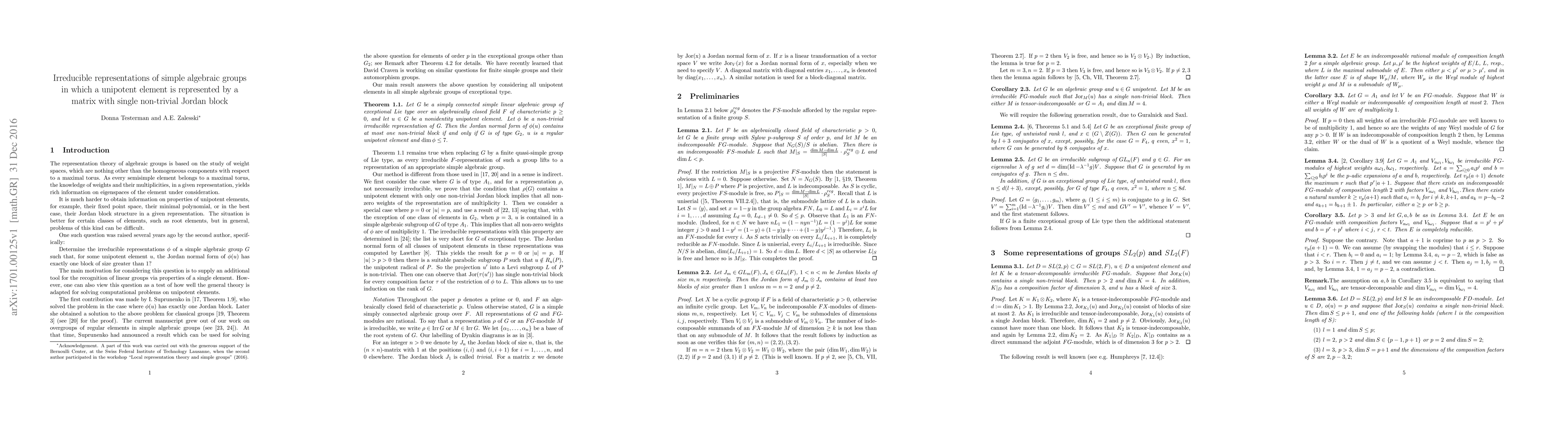 This paper proves that in simply connected simple linear algebraic groups of exceptional type over fields of characteristic $p\geq 0$, the irreducible representation $\phi$ of a nonidentity unipotent element $u$ has a Jordan normal form with at most one non-trivial block if and only if $G$ is of type $G_2$, $u$ is regular unipotent, and $\dim \phi\leq 7$.