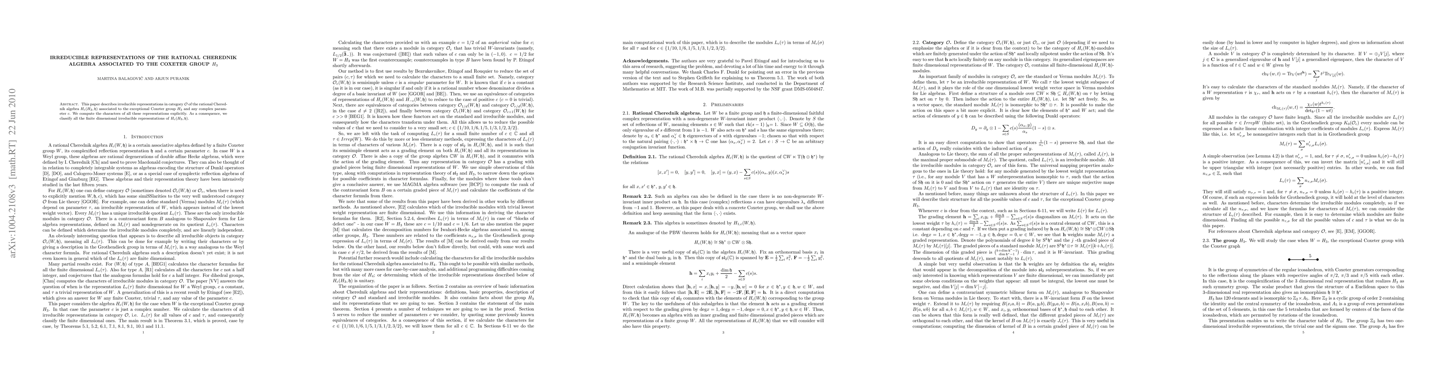 This paper classifies all finite-dimensional irreducible representations of the rational Cherednik algebra H_c(H_3,h) associated with the Coxeter group H_3, explicitly computing their characters within category O.