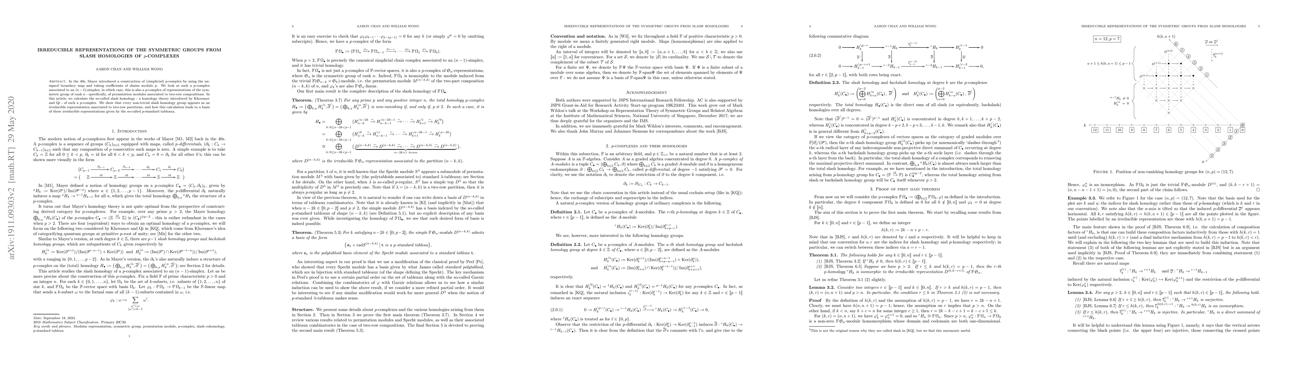This paper explores the slash homology of $p$-complexes associated with $(n-1)$-simplices, revealing that non-trivial slash homology groups correspond to irreducible representations of the symmetric group linked to two-row compositions, with a basis provided by $p$-standard tableaux.