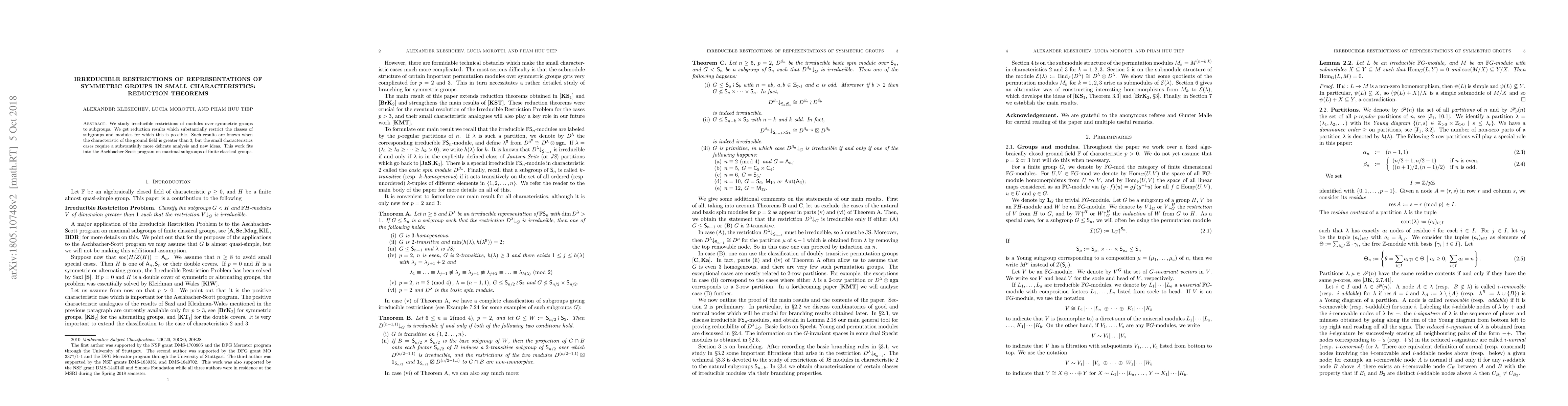 This paper investigates the irreducible restrictions of representations from symmetric groups to their subgroups, focusing on the intricate cases where the characteristic of the field is small. The authors provide significant reduction theorems that limit the applicable classes of subgroups and modules, employing novel techniques for these challenging characteristic scenarios.
