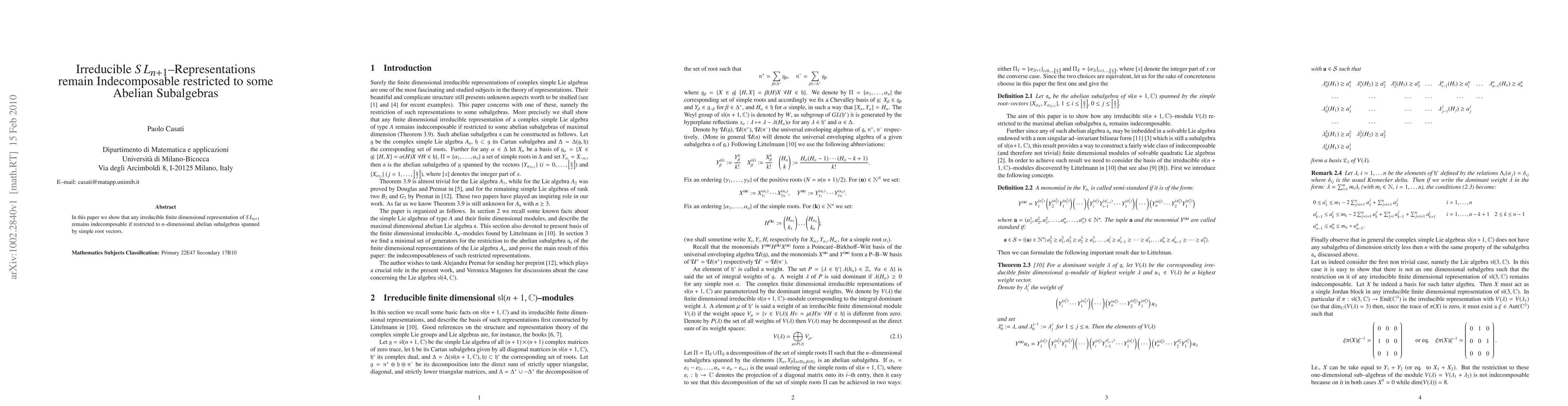 Summary: The paper proves that irreducible finite-dimensional representations of $SL_{n+1}$ retain their indecomposability when restricted to n-dimensional abelian subalgebras formed by simple root vectors. This demonstrates the stability of representation structure under such restrictions.