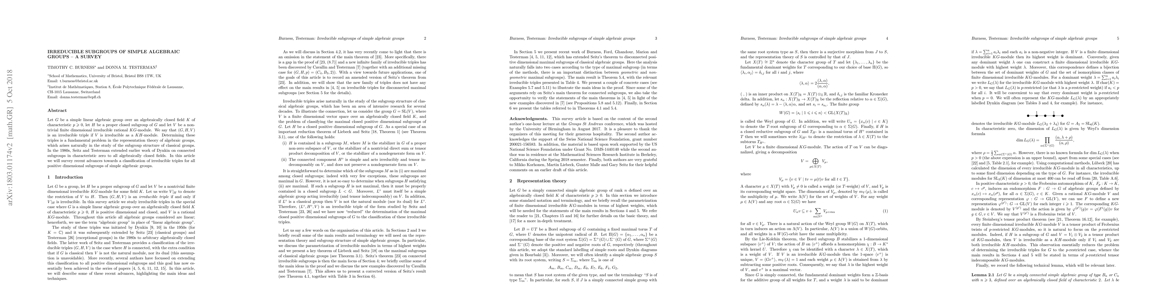 This paper surveys recent developments in the classification of irreducible triples (G, H, V) for simple algebraic groups G, where H is a proper closed subgroup and V is a nontrivial finite-dimensional irreducible rational KG-module that remains irreducible as a KH-module. It builds on earlier work by Dynkin, Seitz, and Testerman to cover all algebraically closed fields of characteristic p ≥ 0.