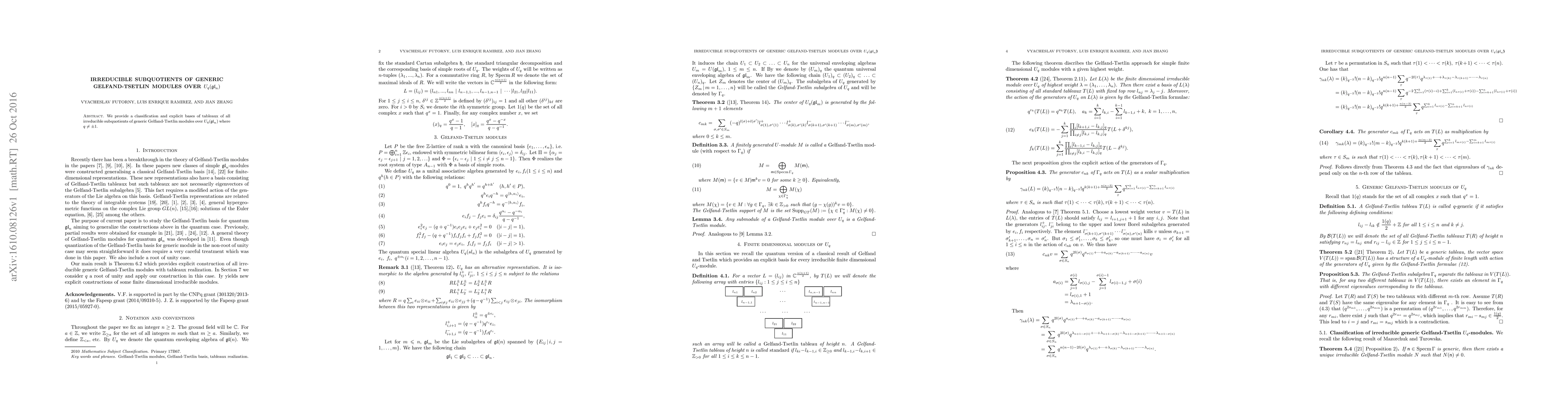 We provide a classification and explicit bases of tableaux of all irreducible subquotients of generic Gelfand-Tsetlin modules over Uq(gl(n)) where q different 1 and -1.