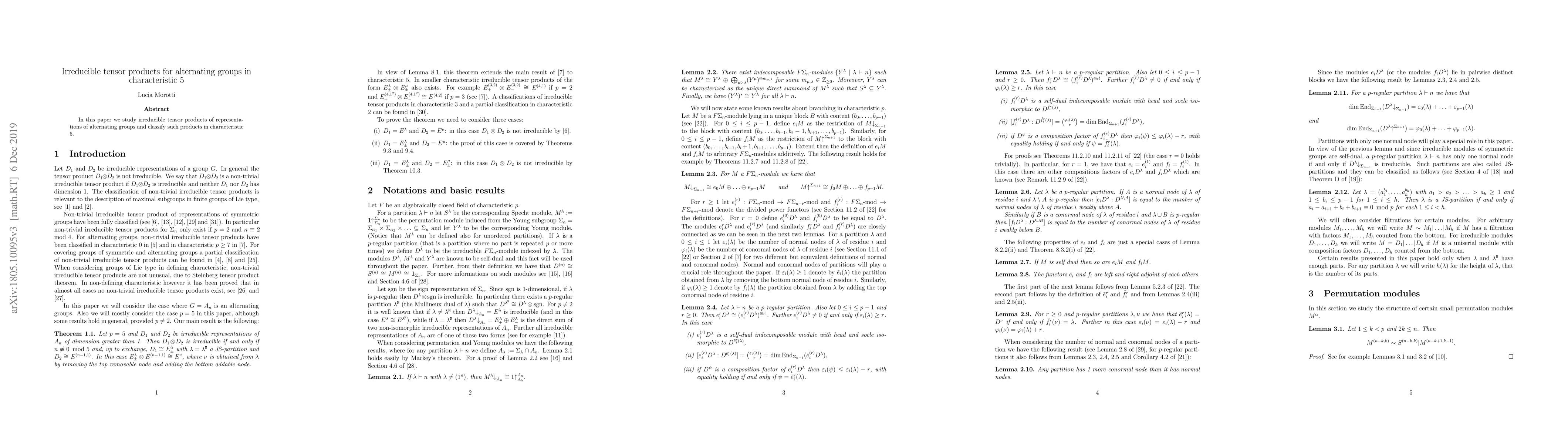 Summary: This research classifies irreducible tensor products of representations for alternating groups in characteristic 5, providing a comprehensive understanding of their structure and behavior. The findings enhance the theoretical framework for group representation theory in modular settings.