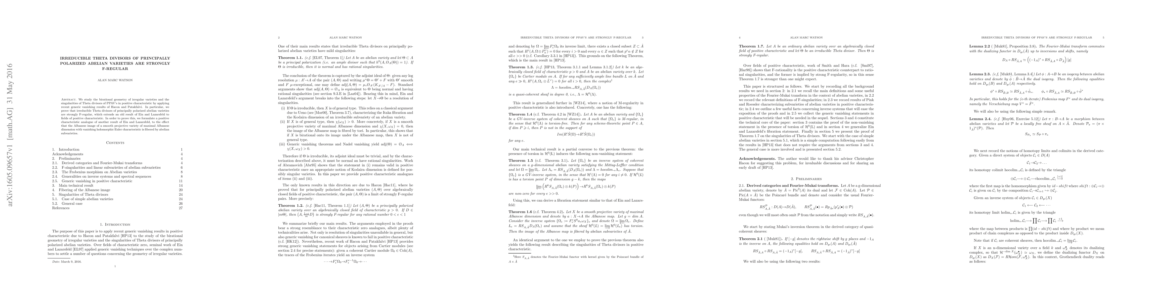 This paper proves that irreducible Theta divisors of principally polarized abelian varieties (PPAVs) are strongly F-regular in fields of positive characteristic, extending Ein and Lazarsfeld's result. It leverages recent generic vanishing results and formulates a positive characteristic analogue of a related result on the Albanese image of smooth projective varieties.