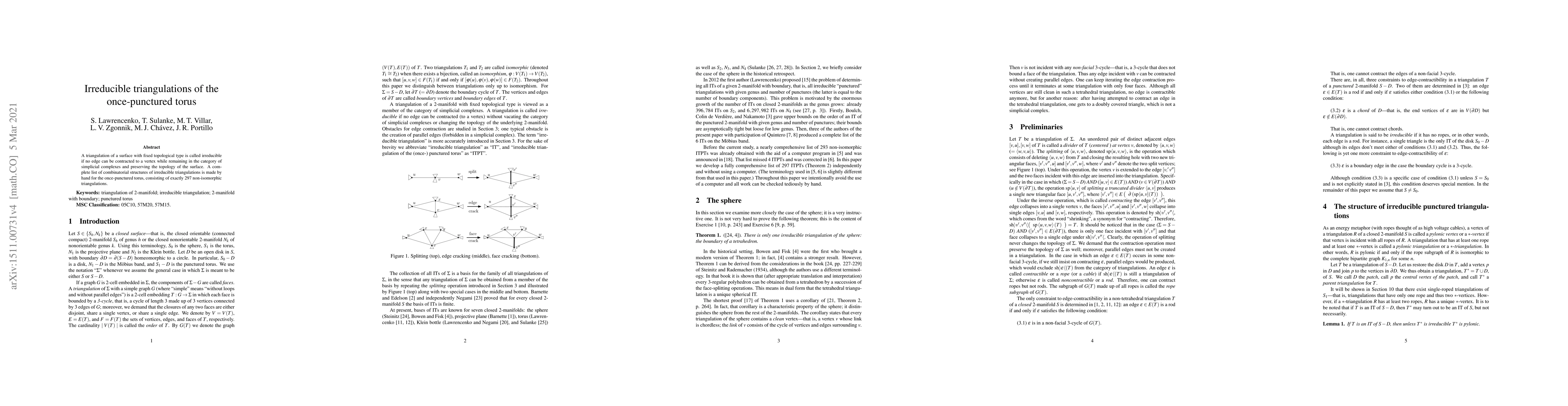 This paper provides a complete enumeration of irreducible triangulations for the once-punctured torus, identifying exactly 297 non-isomorphic combinatorial structures. These triangulations cannot have any edge contracted to a vertex while maintaining the surface's topology.