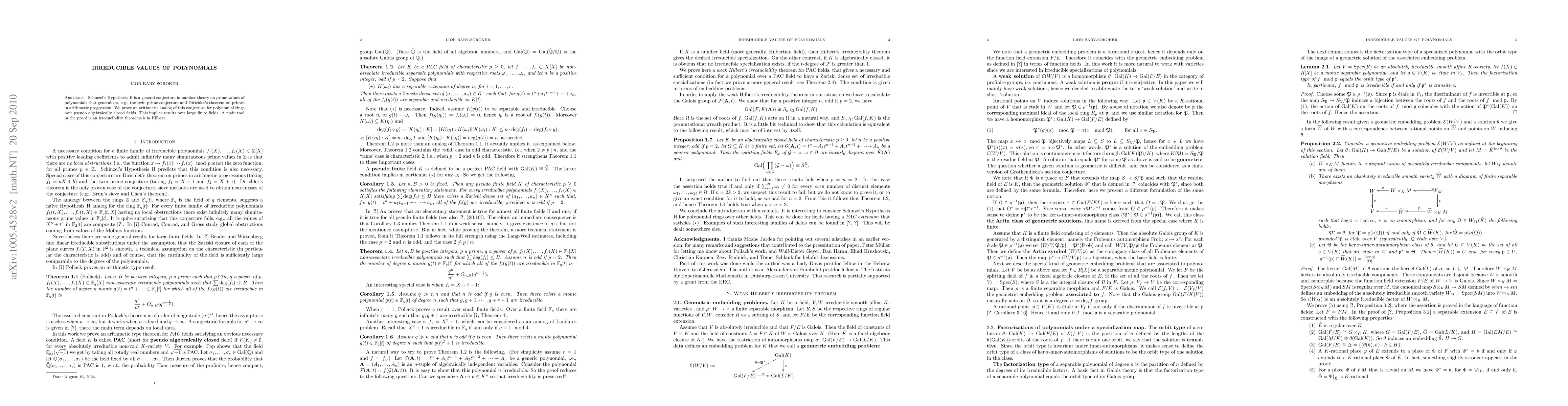 Schinzel's Hypothesis H is a general conjecture in number theory on prime values of polynomials that generalizes, e.g., the twin prime conjecture and Dirichlet's theorem on primes in arithmetic progression. We prove an arithmetic analog of this conjecture for polynomial rings over pseudo algebraically closed fields. This implies results over large finite fields. A main tool in the proof is an irreducibility theorems \`a la Hilbert.