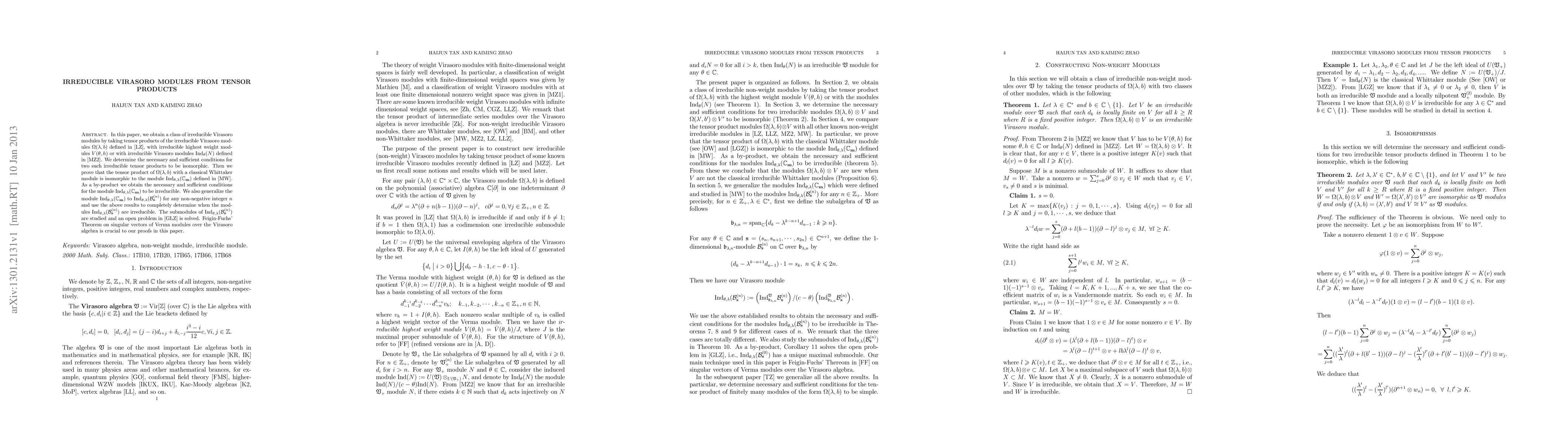 This paper constructs irreducible Virasoro modules via tensor products and identifies conditions for their isomorphism. It determines when tensor products of specific modules are irreducible and solves an open problem regarding submodules. Feigin-Fuchs' Theorem is key to the proofs.