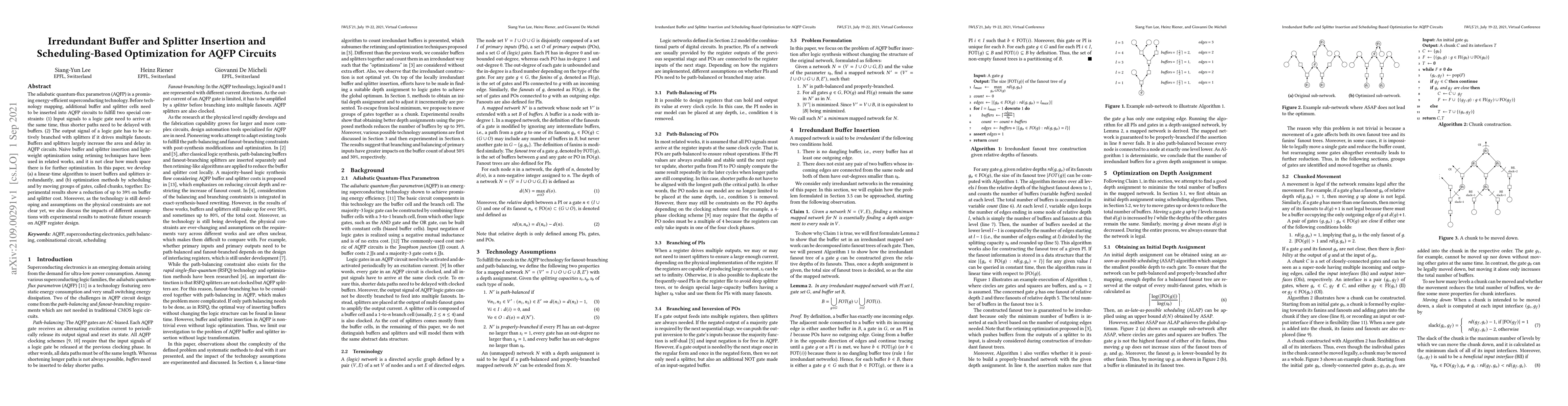This paper presents a linear-time algorithm for the optimal insertion of irredundant buffers and splitters in AQFP circuits, along with optimization techniques using scheduling and gate chunking, achieving up to a 39% reduction in buffer and splitter costs. It also explores the impact of different physical assumptions on AQFP register design to guide future research.