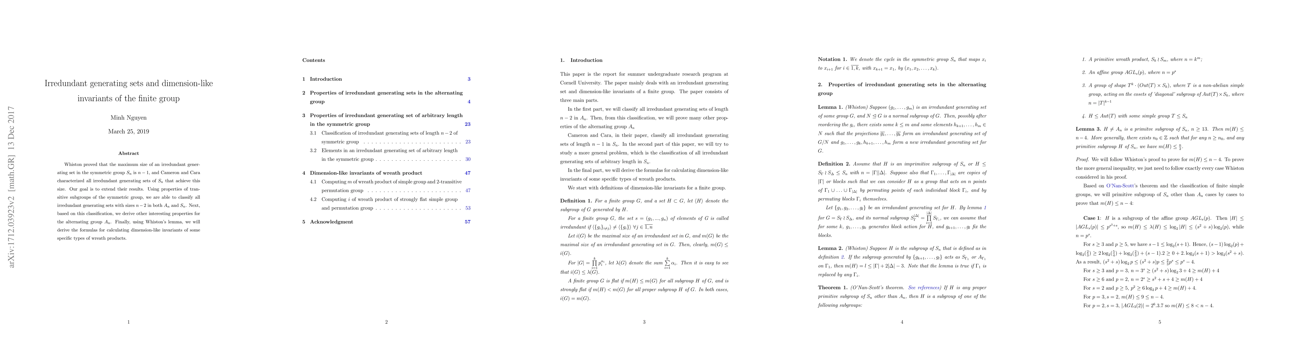 Researchers classify irredundant generating sets for symmetric groups with sizes n-2, derive properties of alternating groups, and calculate dimension-like invariants of wreath products using Whiston's lemma.