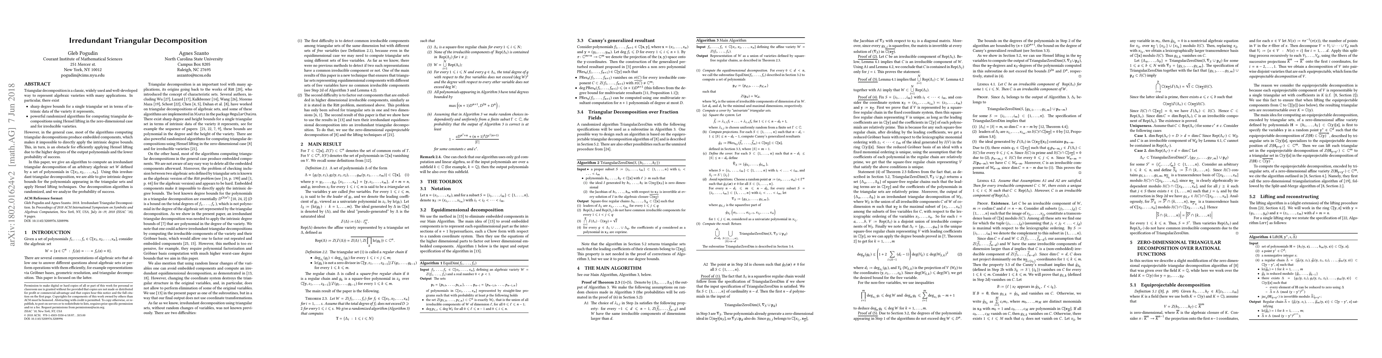 This paper presents an algorithm for computing an irredundant triangular decomposition of an algebraic set, eliminating embedded components. It provides intrinsic degree bounds for the resulting polynomials and enables efficient application of Hensel lifting techniques, with an analysis of the algorithm's success probability.