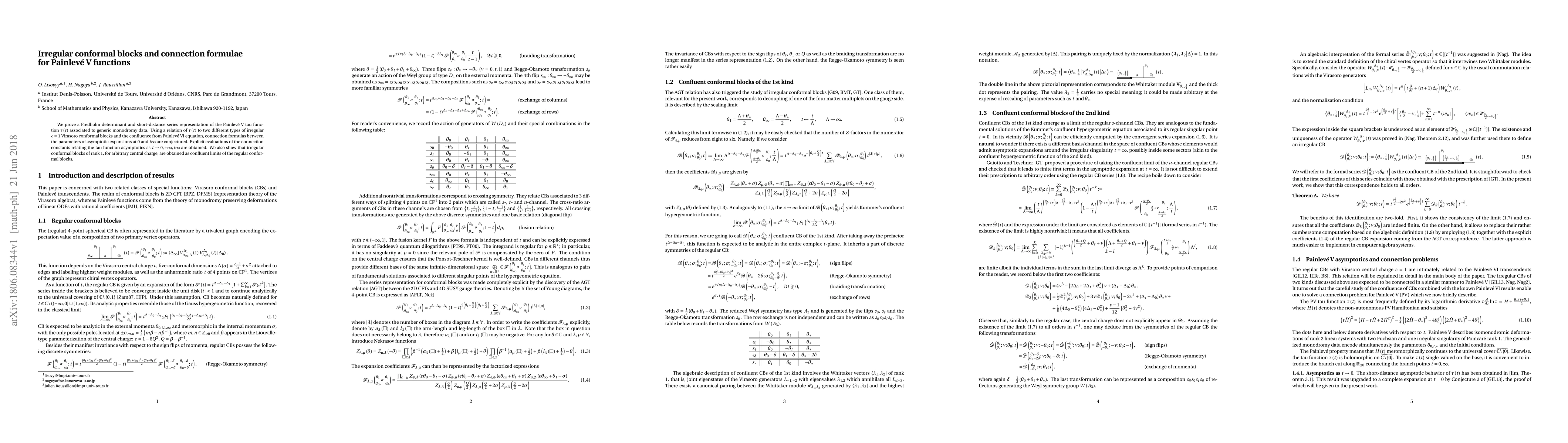 This paper establishes Fredholm determinant and series representations for the Painlevé V tau function, linking it to irregular conformal blocks and deriving conjectured connection formulas between its asymptotic expansions. It also demonstrates the confluence of regular conformal blocks to irregular ones.