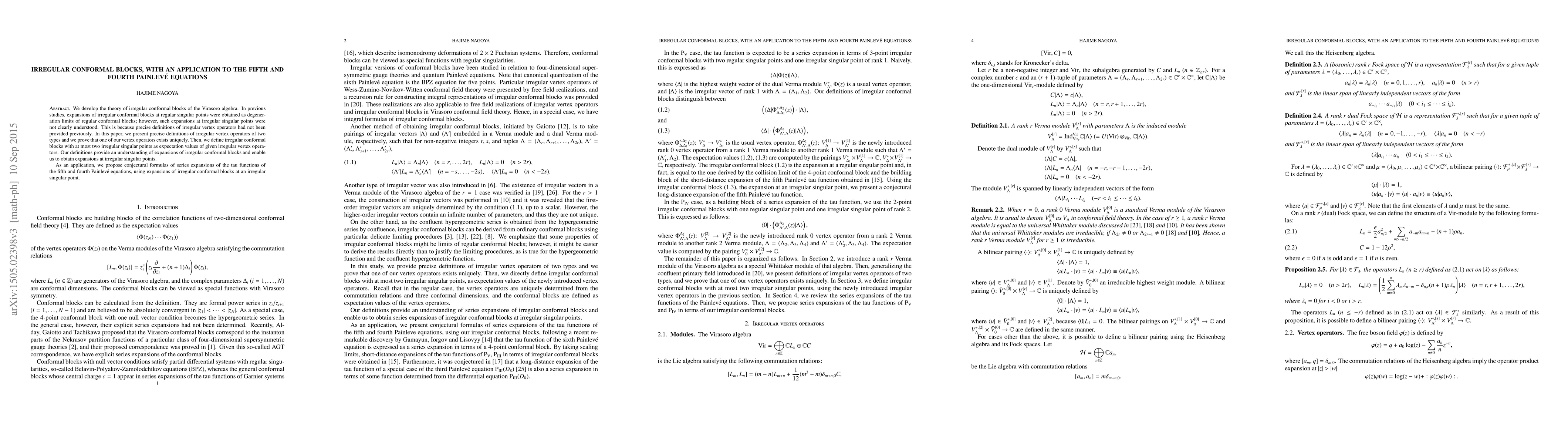 This paper develops the theory of irregular conformal blocks for the Virasoro algebra, introducing precise definitions for irregular vertex operators and proving the uniqueness of one type. It defines irregular conformal blocks with up to two singular points and provides expansions at irregular singular points, applying the theory to propose conjectural expansions of tau functions for the fifth and fourth Painlevé equations.