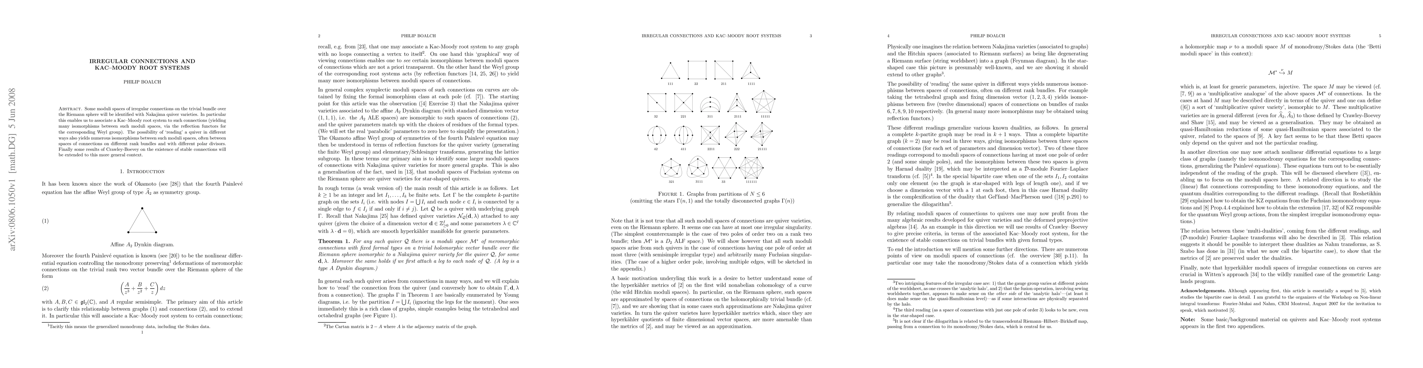 Some moduli spaces of irregular connections on the trivial bundle over the Riemann sphere will be identified with Nakajima quiver varieties. In particular this enables us to associate a Kac-Moody root system to such connections (yielding many isomorphisms between such moduli spaces, via the reflection functors for the corresponding Weyl group). The possibility of 'reading' a quiver in different ways also yields numerous isomorphisms between such moduli spaces, often between spaces of connections on different rank bundles and with different polar divisors. Finally some results of Crawley-Boevey on the existence of stable connections will be extended to this more general context.