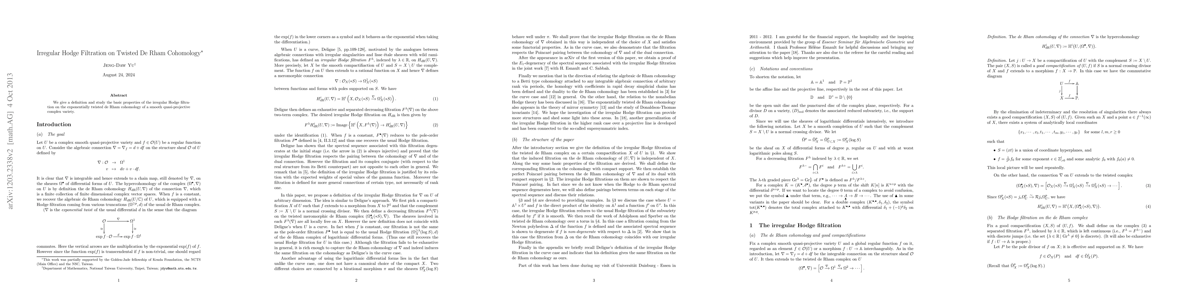 This paper defines the irregular Hodge filtration on the twisted de Rham cohomology of smooth quasi-projective complex varieties and examines its fundamental properties. It provides insights into the structure of this filtration in the context of algebraic geometry.