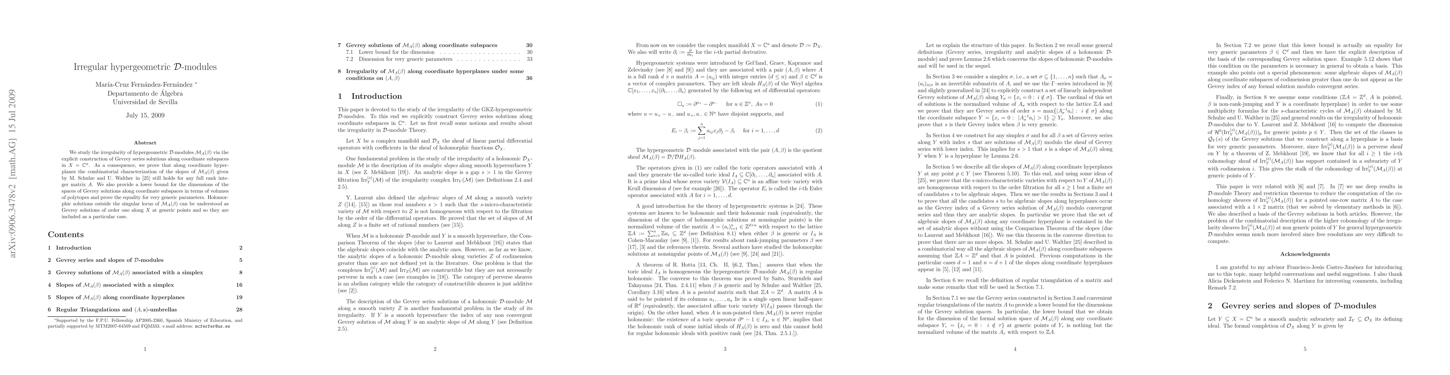 This research paper studies the irregularity of hypergeometric D-modules through explicit construction of Gevrey series solutions, proving a combinatorial characterization along coordinate subspaces without assuming matrix A properties.
