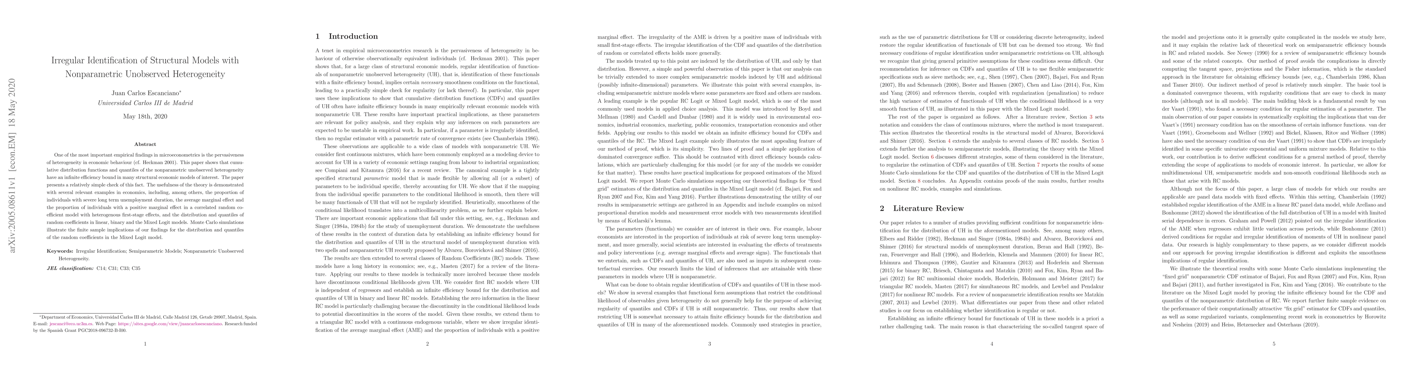 This paper investigates the identification challenges in structural economic models due to nonparametric unobserved heterogeneity, demonstrating infinite efficiency bounds for distribution functions and quantiles. It provides practical examples and Monte Carlo simulations to illustrate the implications for models like Mixed Logit, highlighting issues in identifying long-term unemployment duration and marginal effects.