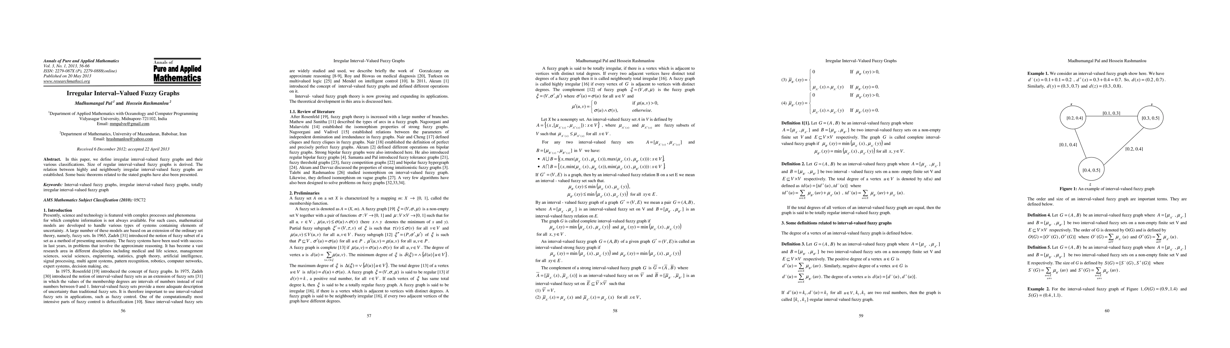 Summary: This paper introduces irregular interval-valued fuzzy graphs, explores their classifications, and derives the size of regular interval-valued fuzzy graphs. It also establishes relationships between highly and neighbourly irregular interval-valued fuzzy graphs and presents basic theorems related to these structures.