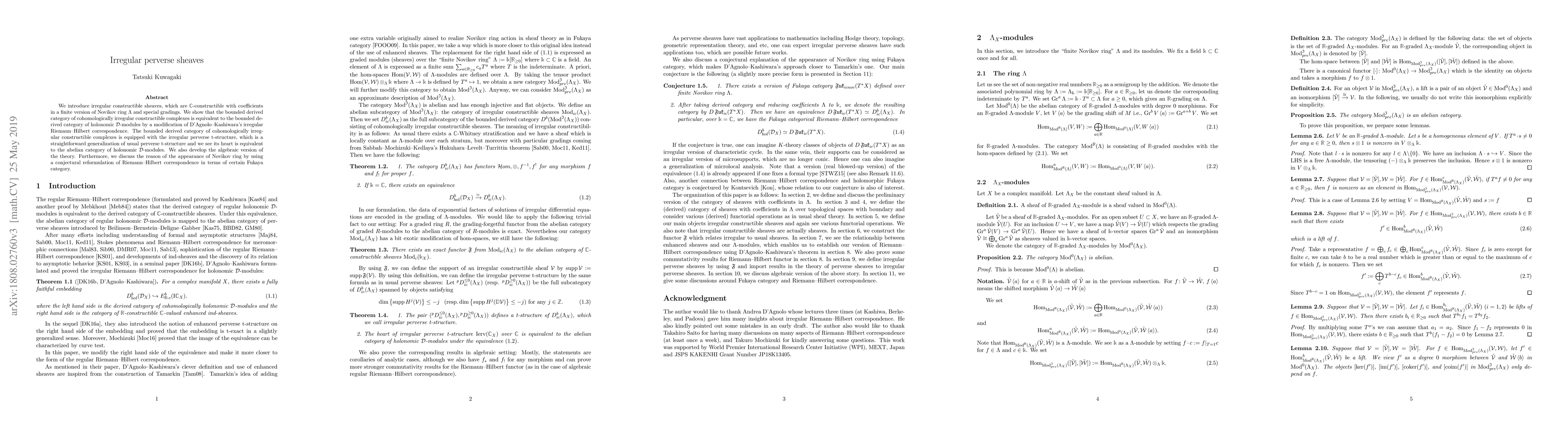We introduce irregular constructible sheaves, which are $\mathbb{C}$-constructible with coefficients in a finite version of Novikov ring $\Lambda$ and special gradings. We show that the bounded derived category of cohomologically irregular constructible complexes is equivalent to the bounded derived category of holonomic $\mathcal{D}$-modules by a modification of D'Agnolo--Kashiwara's irregular Riemann--Hilbert correspondence. The bounded derived category of cohomologically irregular constructible complexes is equipped with the irregular perverse t-structure, which is a straightforward generalization of usual perverse t-structure and we see its heart is equivalent to the abelian category of holonomic $\mathcal{D}$-modules. We also develop the algebraic version of the theory. Furthermore, we discuss the reason of the appearance of Novikov ring by using a conjectural reformulation of Riemann--Hilbert correspondence in terms of certain Fukaya category.