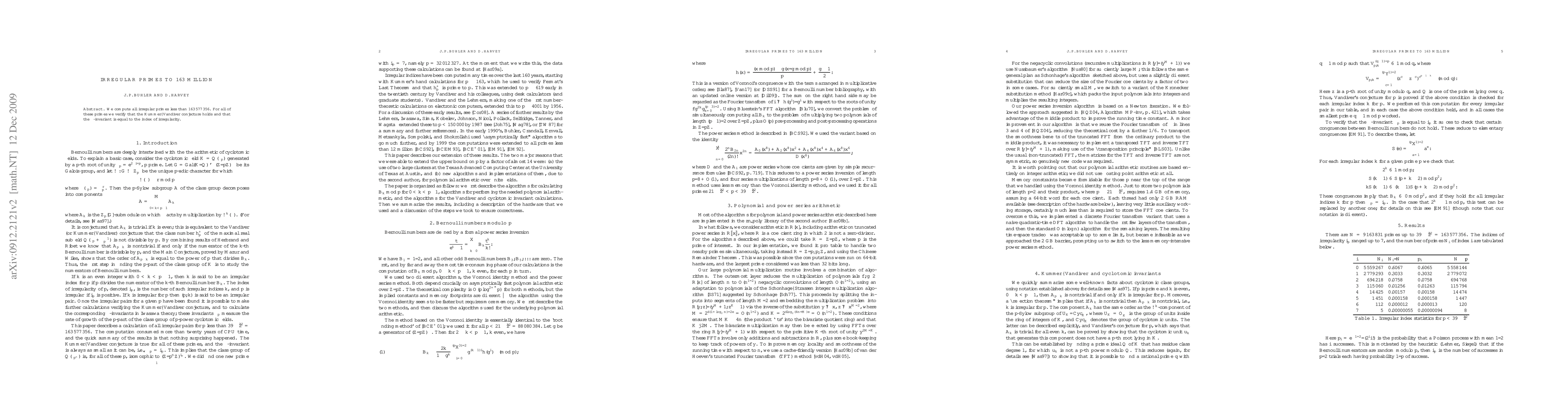 We compute all irregular primes less than 163,577,356. For all of these primes we verify that the Kummer-Vandiver conjecture holds and that the lambda-invariant is equal to the index of irregularity.