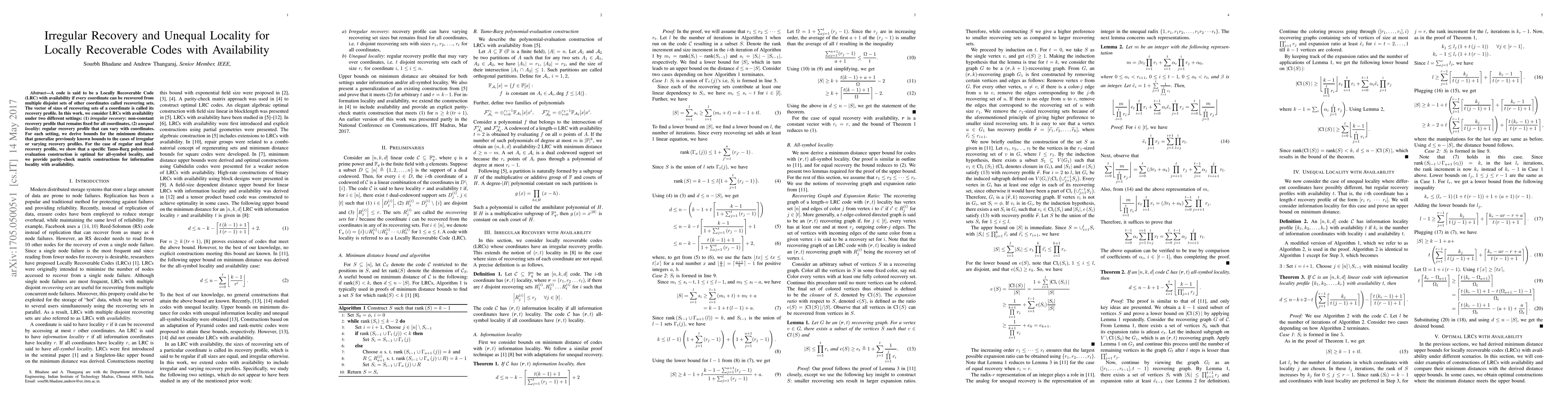 This paper explores Locally Recoverable Codes (LRC) with availability under irregular recovery and unequal locality settings, deriving new bounds for minimum distance and demonstrating optimal constructions for specific cases. It also provides constructions for information locality with availability.