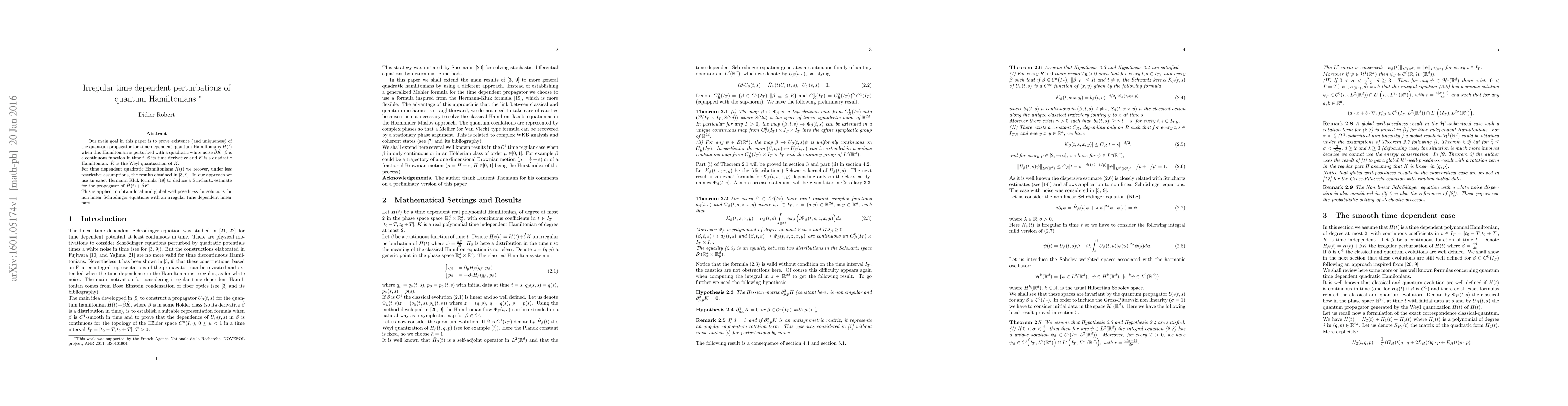 Our main goal in this paper is to prove existence (and uniqueness) of the quantum propagator for time dependent quantum Hamiltonians $\hat H(t)$ when this Hamiltonian is perturbed with a quadratic white noise $\dot{\beta}\hat K$. $\beta$ is a continuous function in time $t$, $\dot \beta$ its time derivative and $K$ is a quadratic Hamiltonian. $\hat K$ is the Weyl quantization of $K$. For time dependent quadratic Hamiltonians $H(t)$ we recover, under less restrictive assumptions, the results obtained in \cite{bofu, du}.In our approach we use an exact Hermann Kluk formula \cite{ro2} to deduce a Strichartz estimate for the propagator of $\hat H(t) +\dot \beta K$. This is applied to obtain local and global well posedness for solutions for non linear Schr\"odinger equations with an irregular time dependent linear part.