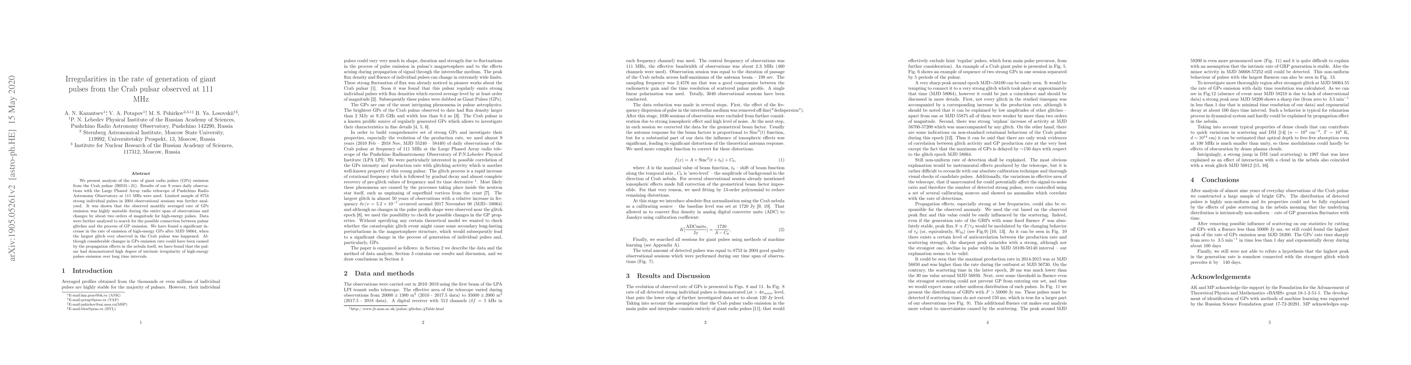 We present analysis of the rate of giant radio pulses (GPs) emission from the Crab pulsar (B0531+21). Results of our 9 years daily observations with the Large Phased Array radio telescope of Pushchino Radio Astronomy Observatory at 111 MHz were used. Limited sample of 8753 strong individual pulses in 2004 observational sessions was further analysed. It was shown that the observed monthly averaged rate of GPs emission was highly unstable during the entire span of observations and changes by about two orders of magnitude for high-energy pulses. Data were further analysed to search for the possible connection between pulsar glitches and the process of GP emission. We have found a significant increase in the rate of emission of high-energy GPs after MJD 58064, when the largest glitch ever observed in the Crab pulsar was happened. Although considerable changes in GPs emission rate could have been caused by the propagation effects in the nebula itself, we have found that the pulsar had demonstrated high degree of intrinsic irregularity of high-energy pulses emission over long time intervals.